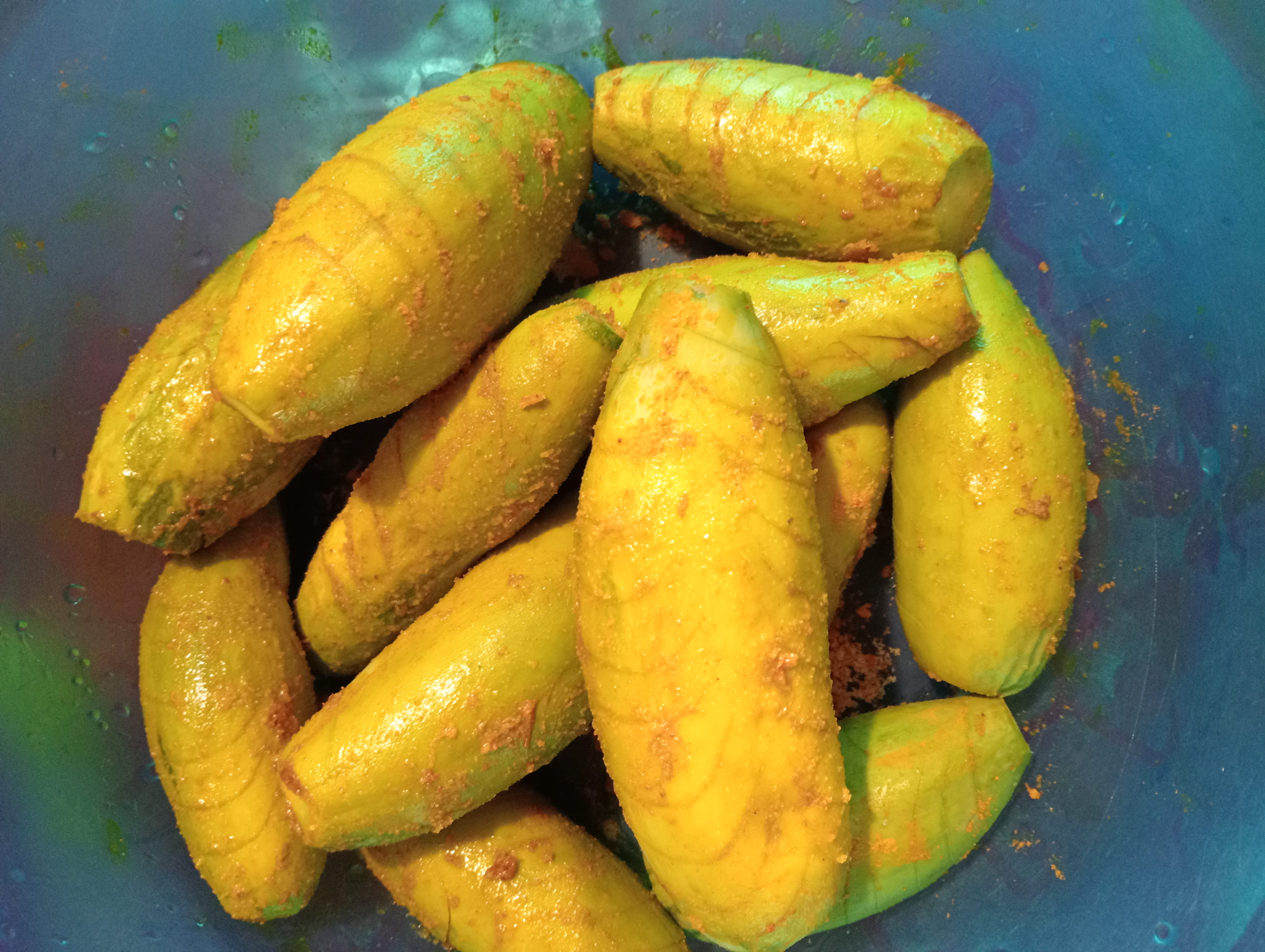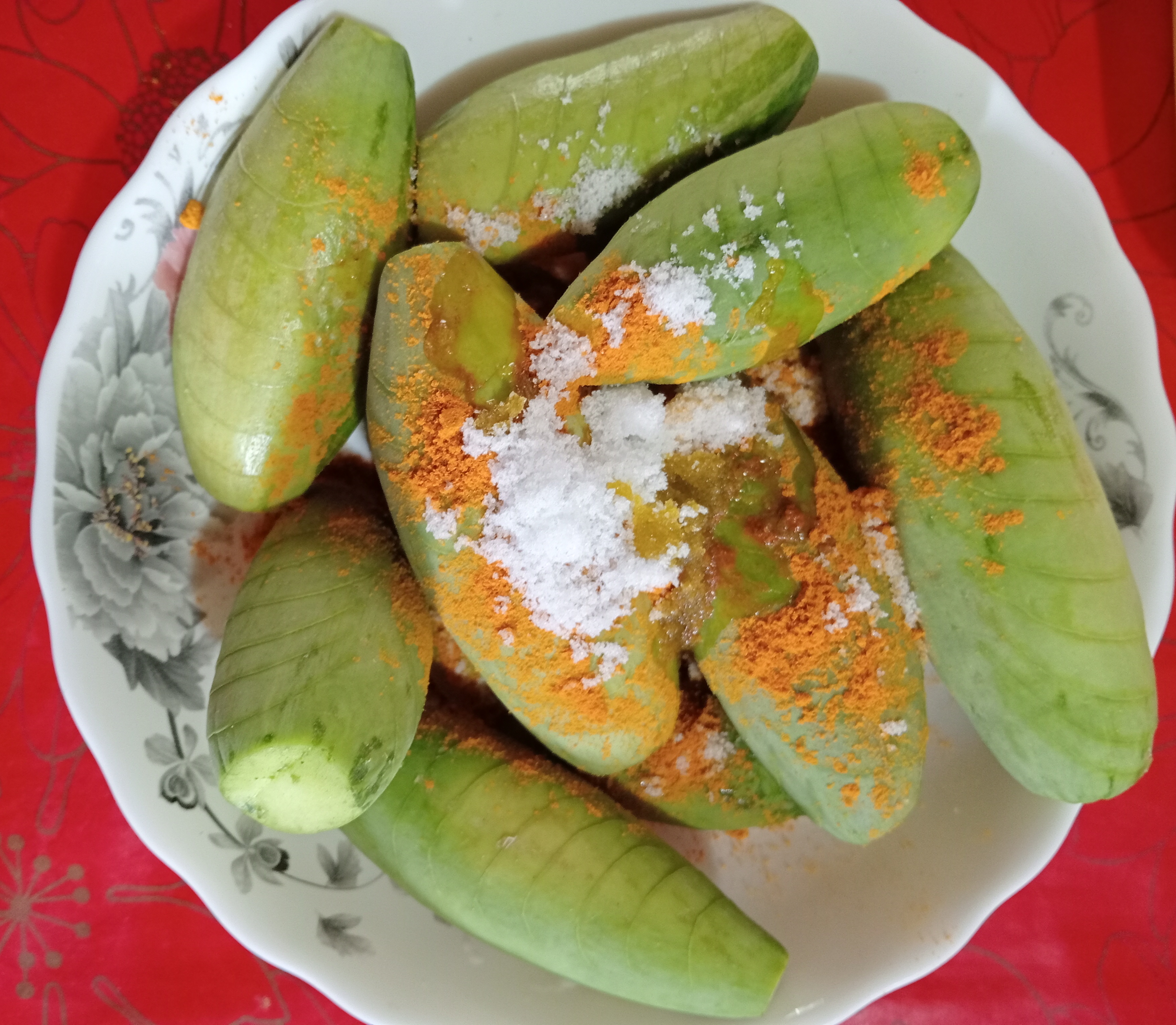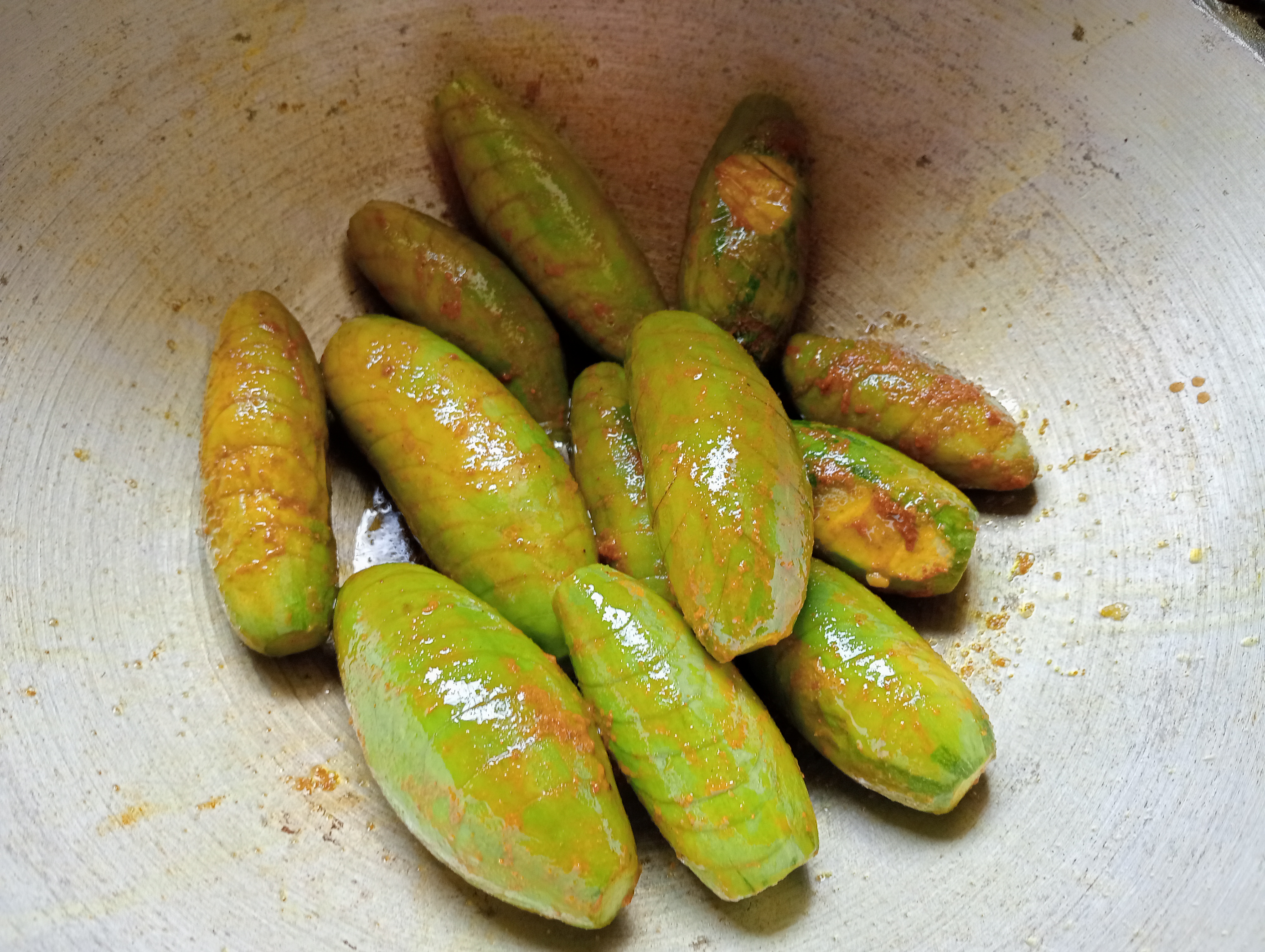 - এবার হলুদ, লবণ, সরিষার তেল এবং হালকা লাল মরিচের গুড়ো দিয়ে ভালোভাবে মেখে নিলাম পটলগুলো।