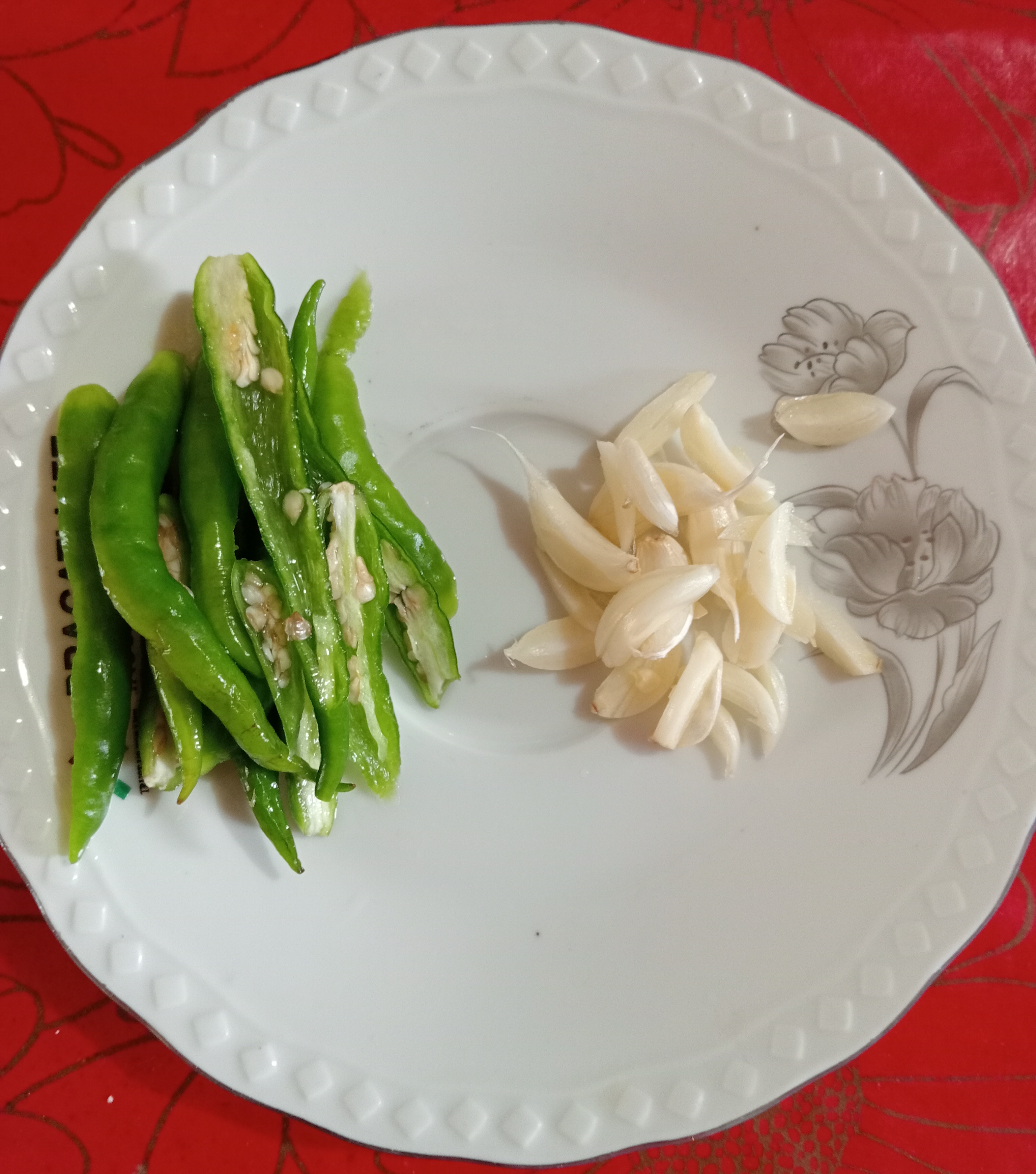 - এই ফাঁকে কাঁচা মরিচ ও রসুন গুলো ধুইয়ে কেটে নিলাম।