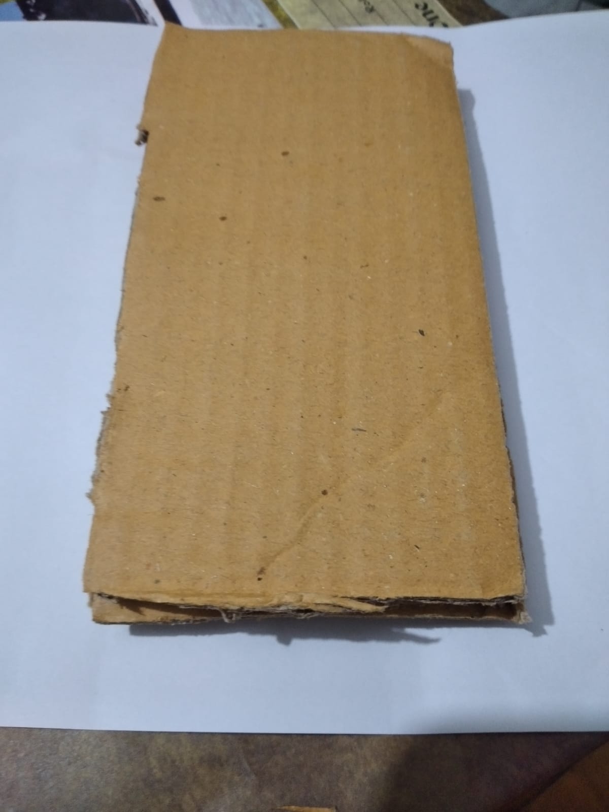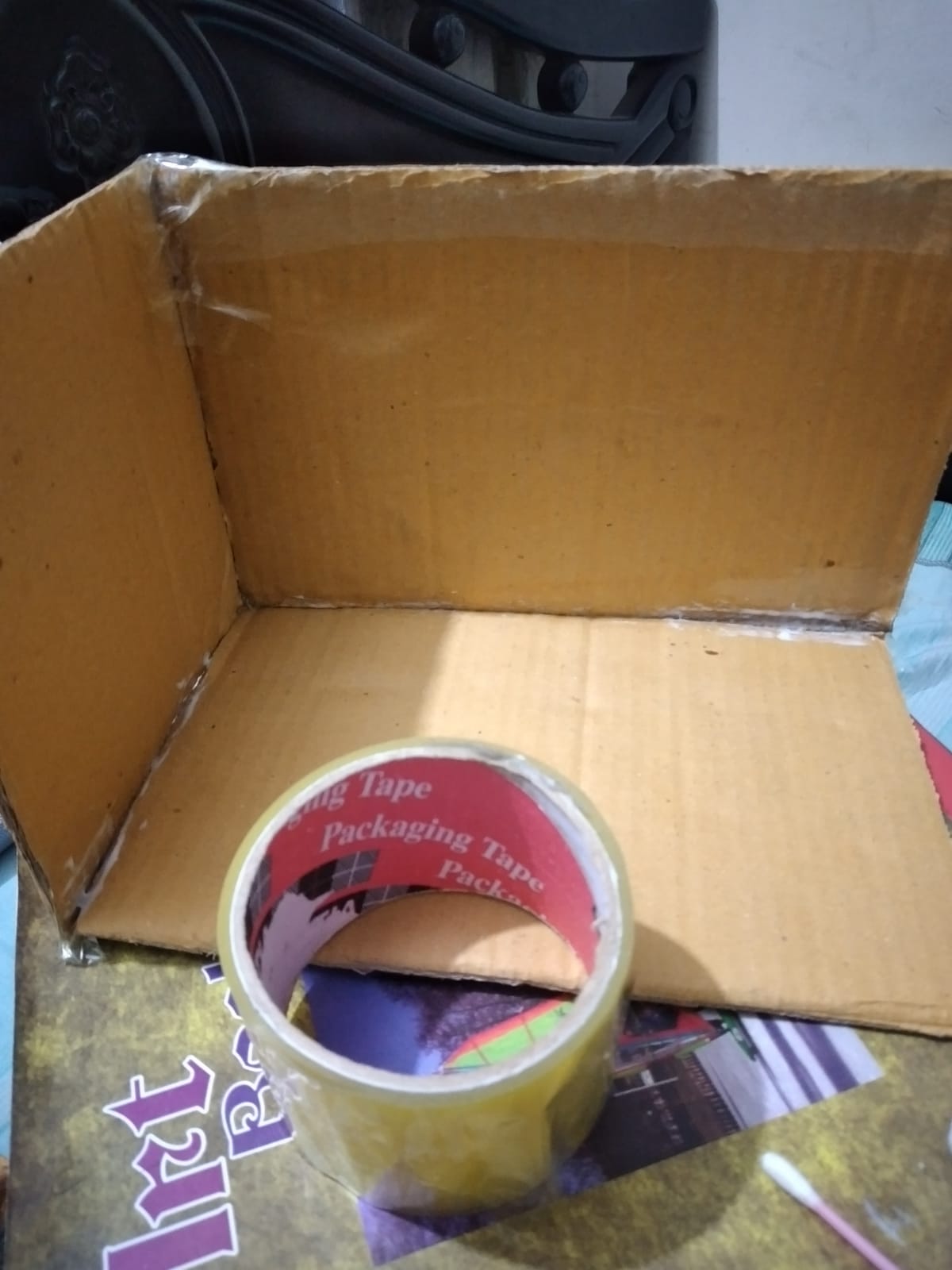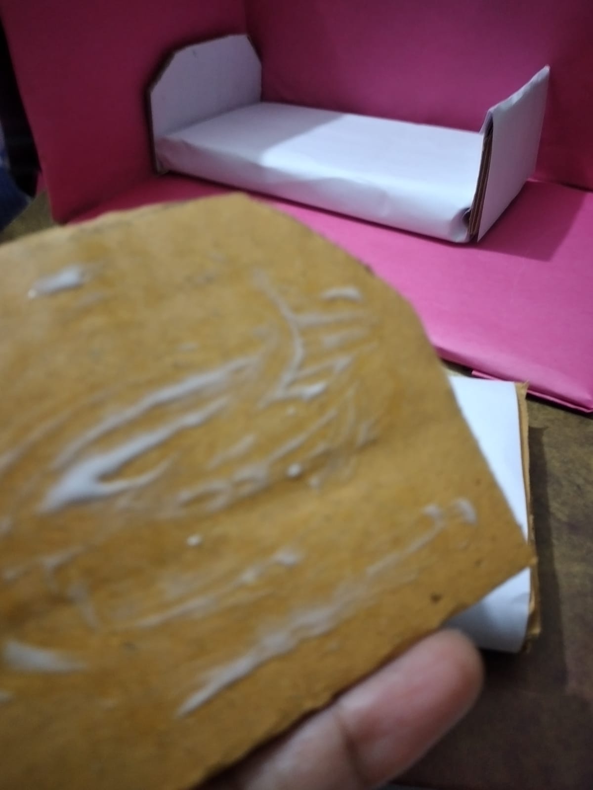 খাট বানাতে কার্ড বোর্ডকে সমান করে চারটি টুকরো করে নিলাম।এরপর আঠা দিয়ে চারটি লাগিয়ে নিলাম।এরপর সাদা কাগজ দিয়ে আঠা লাগিয়ে দিলাম।