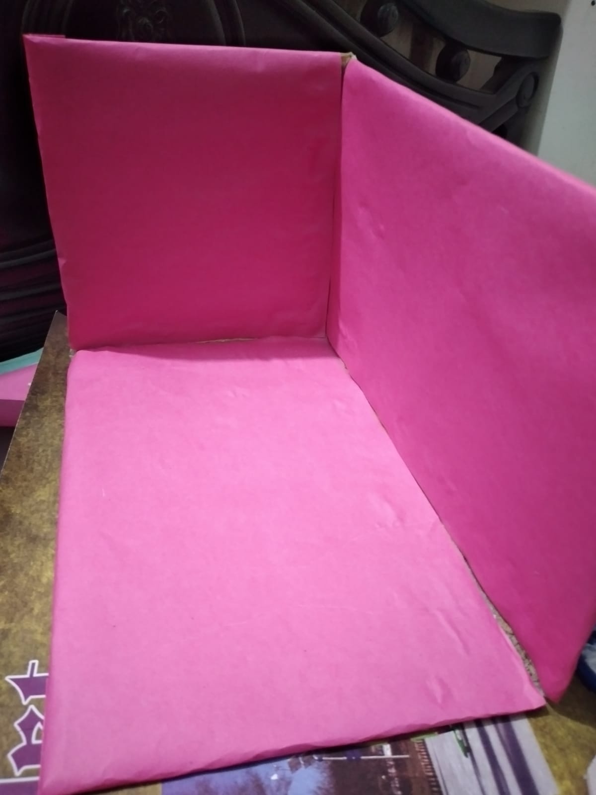 প্রথমে আমি ঘরের দেয়াল করতে তিন টুকরো কাগজ কেটে নিয়েছি।এরপর টেপ দিয়ে খুব শক্ত করে আটকে নিয়েছি।এরপর গোলাপি রঙের কাগজ কেটে দেয়াল ও ফ্লোরে আঠা দিয়ে আটকে দিয়েছি। বাচ্চারা গোলাপি রঙটা খুব পছন্দ করে।তাই এই রঙটা দিলাম।