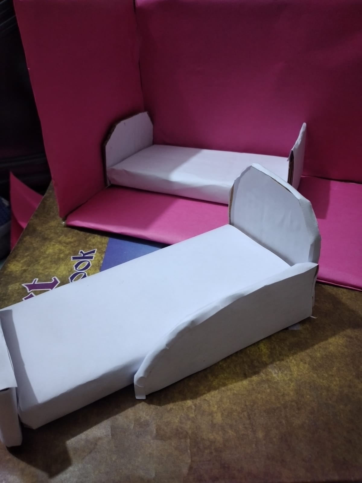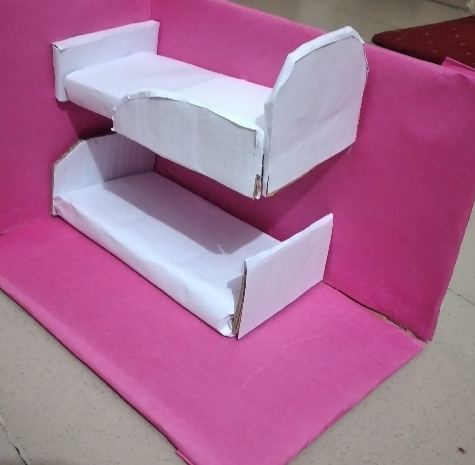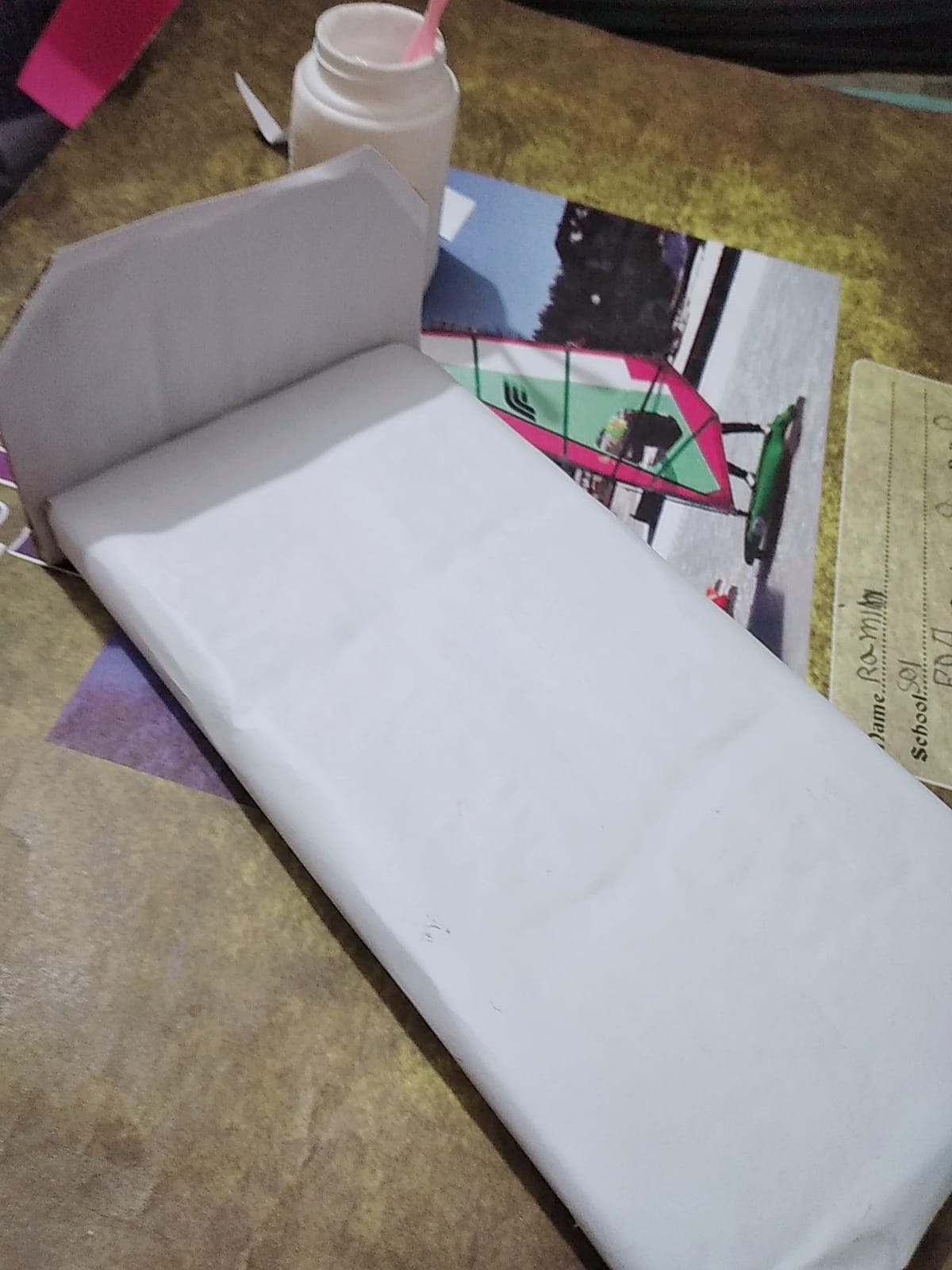 এরপর উপরের খাটের জন্য পাশের জন্য মাপ দিয়ে কাগজ কেটে নিলাম।এরপর কাগজ কেটে সাদা কাগজ দিয়ে আঠা দিয়ে আটকে নিলাম।এরপর দ্বিতীয় খাটটিও করে নিলাম।