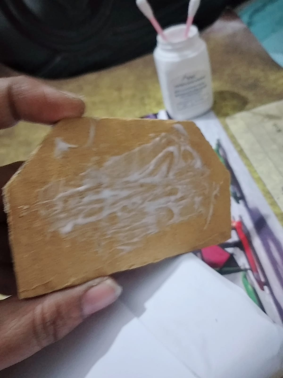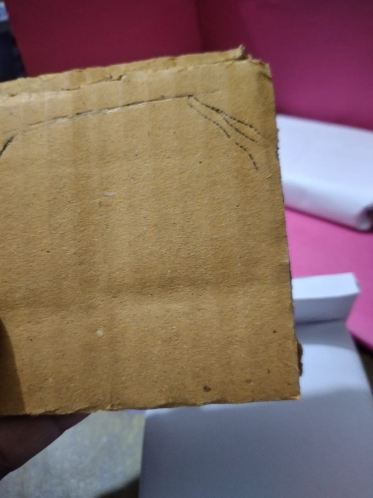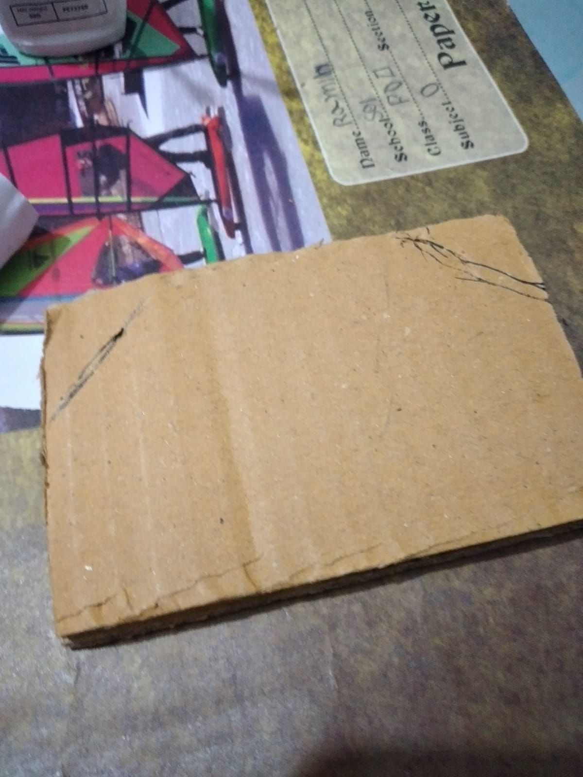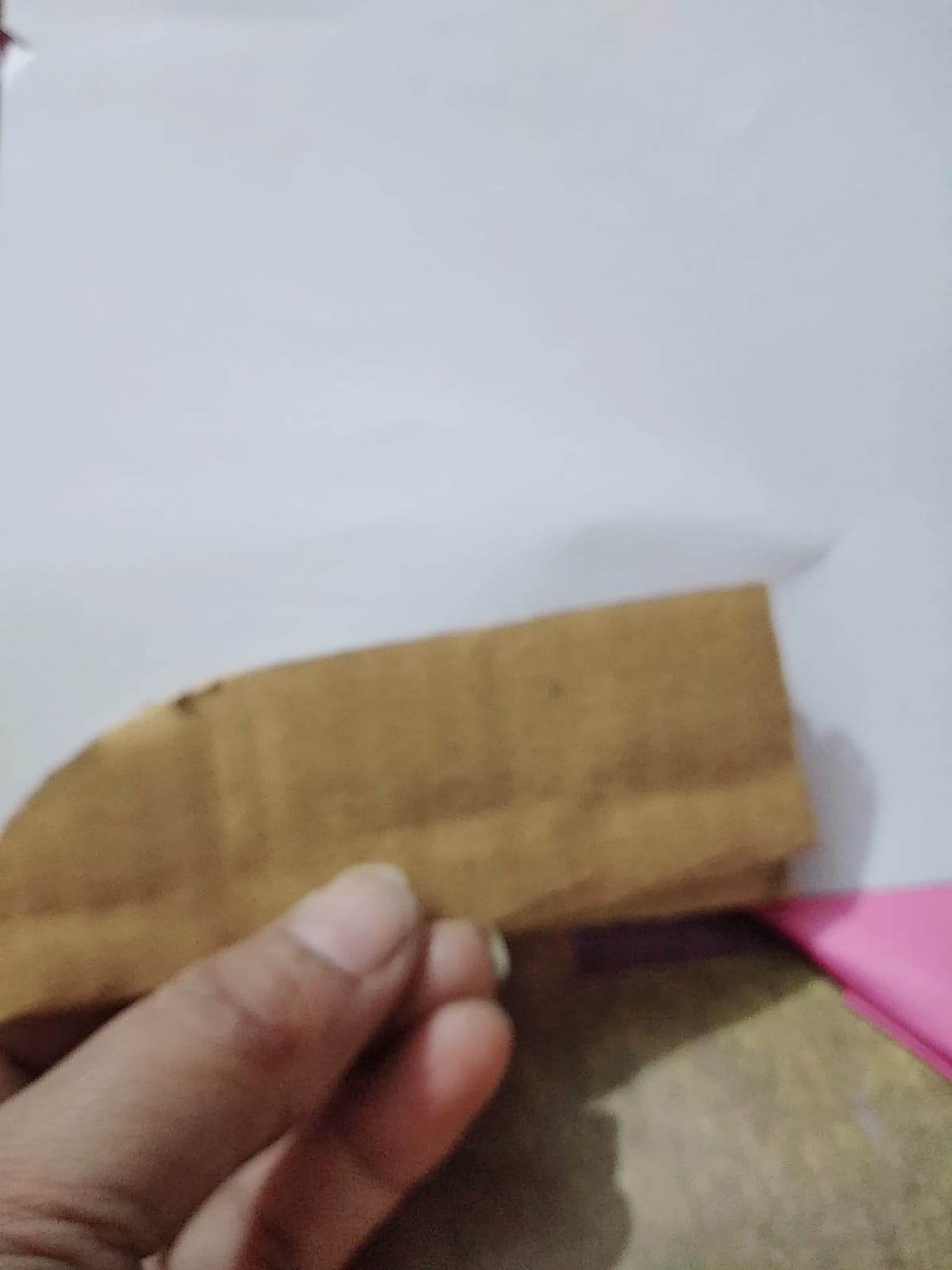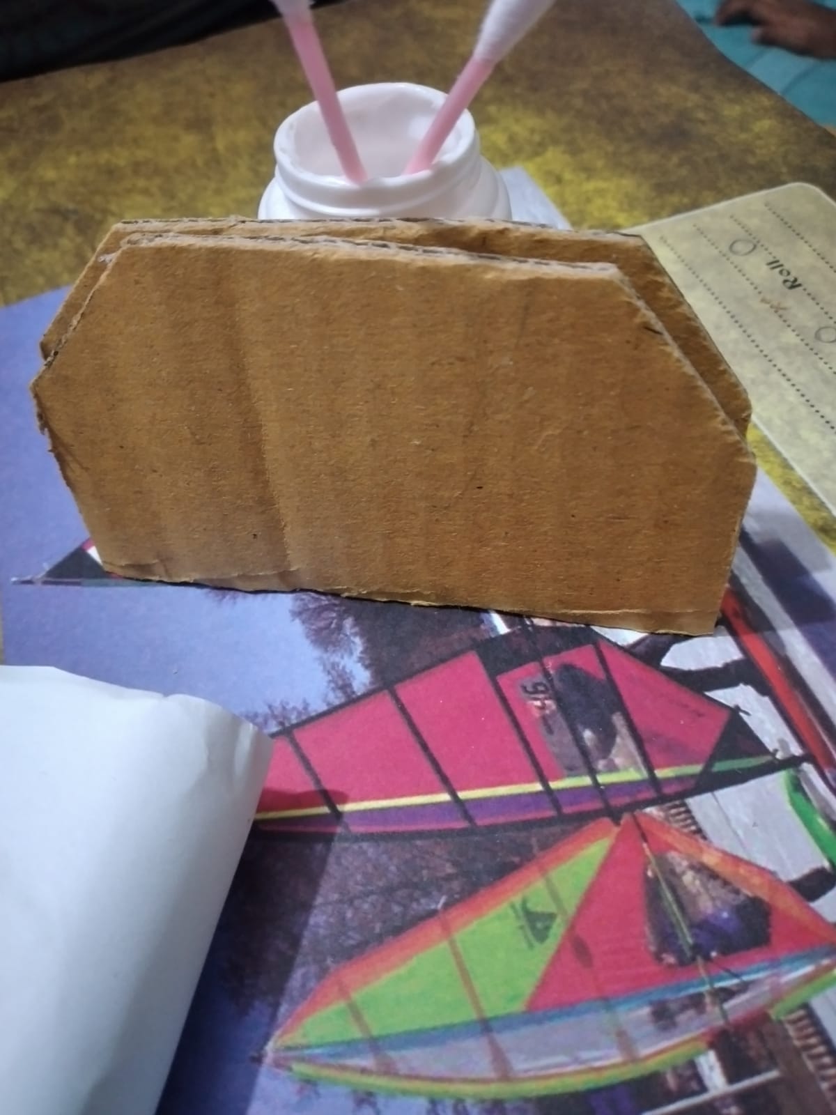 এরপর খাটের দুই পাশের জন্য চার টুকরো কার্ড বোর্ড কেটে কলম দিয়ে এঁকে কেটে নিলাম।এবার কার্ড বোর্ডটি সাদা কাগজে রেখে মাপ মত কেটে নিলাম।এরপর কার্ড বোর্ডের মধ্যে সাদা কাগজ রেখে আঠা দিয়ে আটকে নিলাম।
