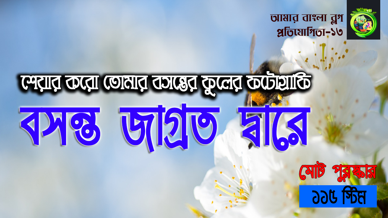 যাইহোক সবাইকে বসন্তের শুভেচ্ছা । আমি ও আপনারা বা যারা আমার বাংলা ব্লগ কমিউনিটির সদস্য আছে, তারা সকলেই মনেপ্রাণে বিশ্বাস করে আমার বাংলা ব্লগ কমিউনিটি প্রতিনিয়ত বিভিন্ন সময়কে কেন্দ্র করে বিভিন্ন রকমের আয়োজন করতে পছন্দ করে। যেহেতু ঋতুরাজ বসন্ত চলছে, তাই বসন্তকে আরো ভালোভাবে আলিঙ্গন করে নেওয়ার জন্য ,বসন্তের সৌন্দর্যকে আরও ভালোভাবে ফুটিয়ে তোলার জন্য,ঋতুরাজ বসন্তের ছোঁয়ায় নিজেদের পোস্টগুলোকে রাঙিয়ে তোলার জন্য, আমার বাংলা ব্লগ এবার একটি ব্যতিক্রমধর্মী বসন্তের ফোঁটা ফুলের ফটোগ্রাফি মূলক প্রতিযোগিতা আয়োজন করতে যাচ্ছে ।
