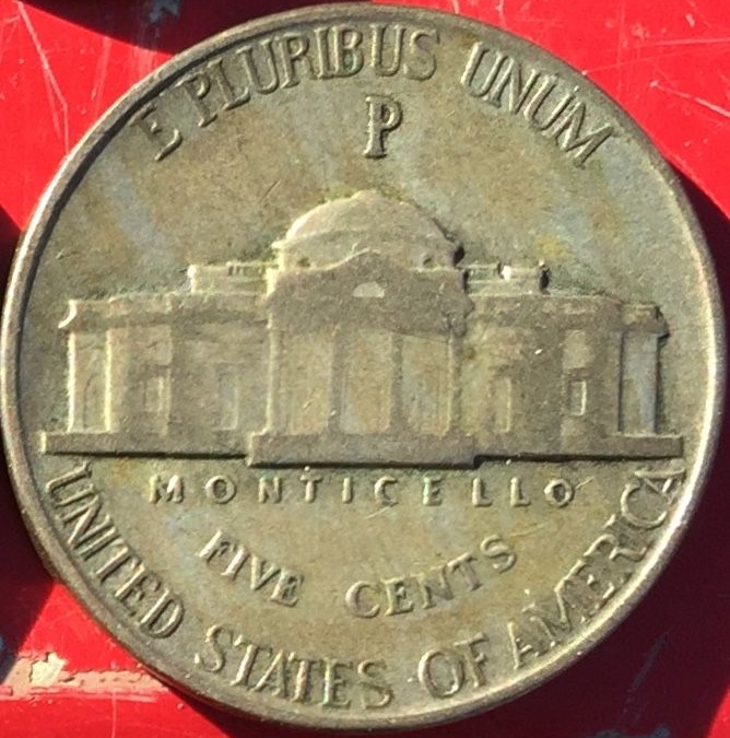 To make it easy to spot the silver war nickels from other nickels, a large “P” mintmark was added on the reverse side of the coins above the dome of Monticello, Jefferson’s famous estate in Virginia. In addition, since coins made of the normal alloy had already been produced at Philadelphia earlier in 1942, the silver nickels made there were the first U.S. coins struck at that mint that sported a mintmark. This change was also made to make it easier to spot the coins when they were redeemed at banks.