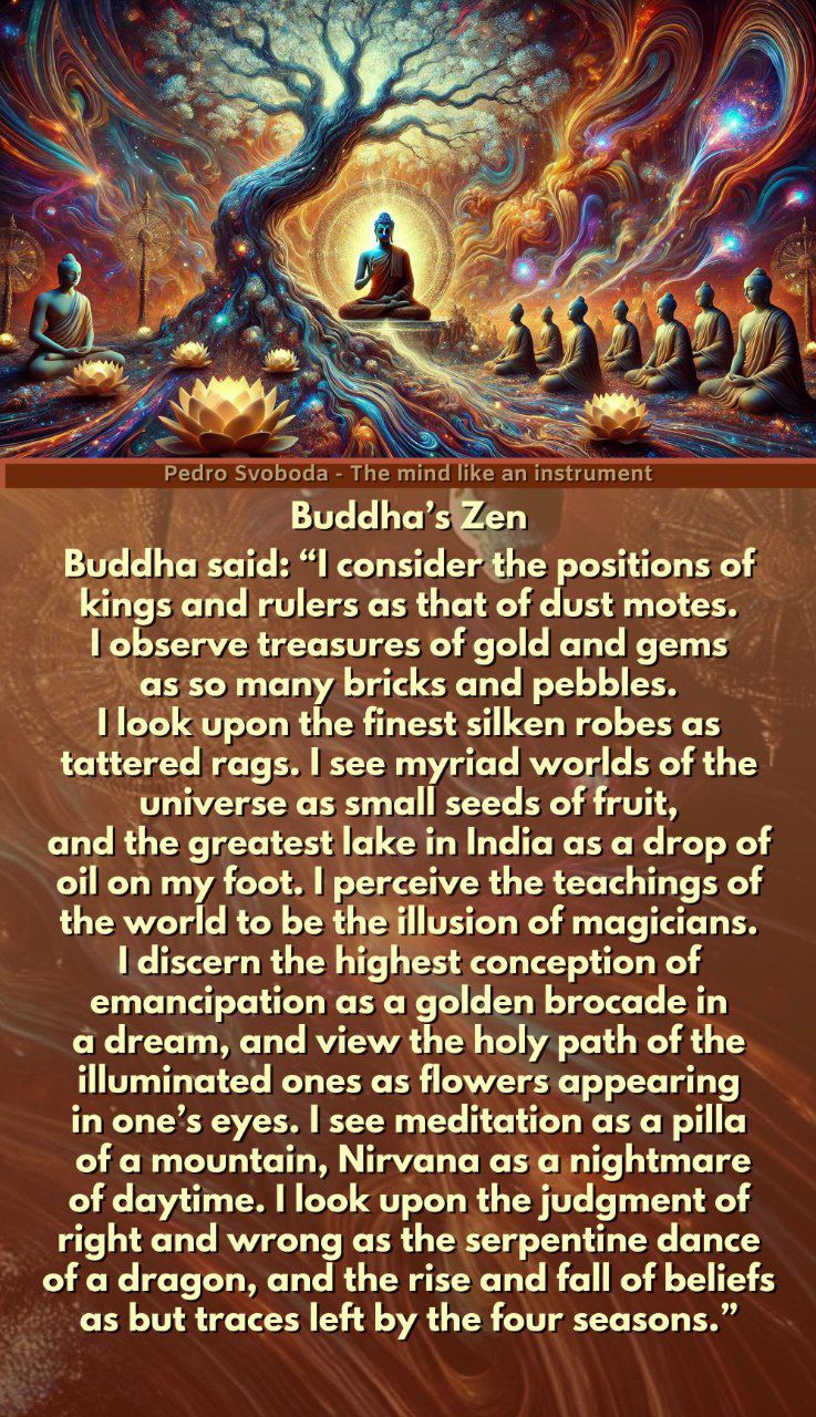 Buddha said: “I consider the positions of kings and rulers as that of dust motes. I observe treasures of gold and gems as so many bricks and pebbles. I look upon the finest silken robes as tattered rags. I see myriad worlds of the universe as small seeds of fruit, and the greatest lake in India as a drop of oil on my foot. I perceive the teachings of the world to be the illusion of magicians. I discern the highest conception of emancipation as a golden brocade in a dream, and view the holy path of the illuminated ones as flowers appearing in one’s eyes. I see meditation as a pillar of a mountain, Nirvana as a nightmare of daytime. I look upon the judgment of right and wrong as the serpentine dance of a dragon, and the rise and fall of beliefs as but traces left by the four seasons.”