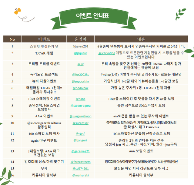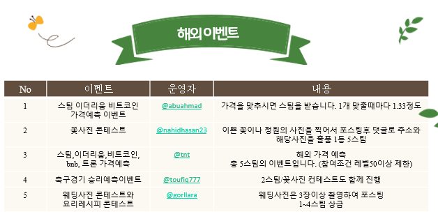 각 이벤트 관련 문의는 주최하시는 스티미언님들께 문의 주시기 바랍니다.
