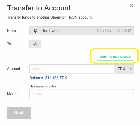 This is TRX transfer to you need to switch account to TRON account, and then put the amount you want to trade, and go to "Next"