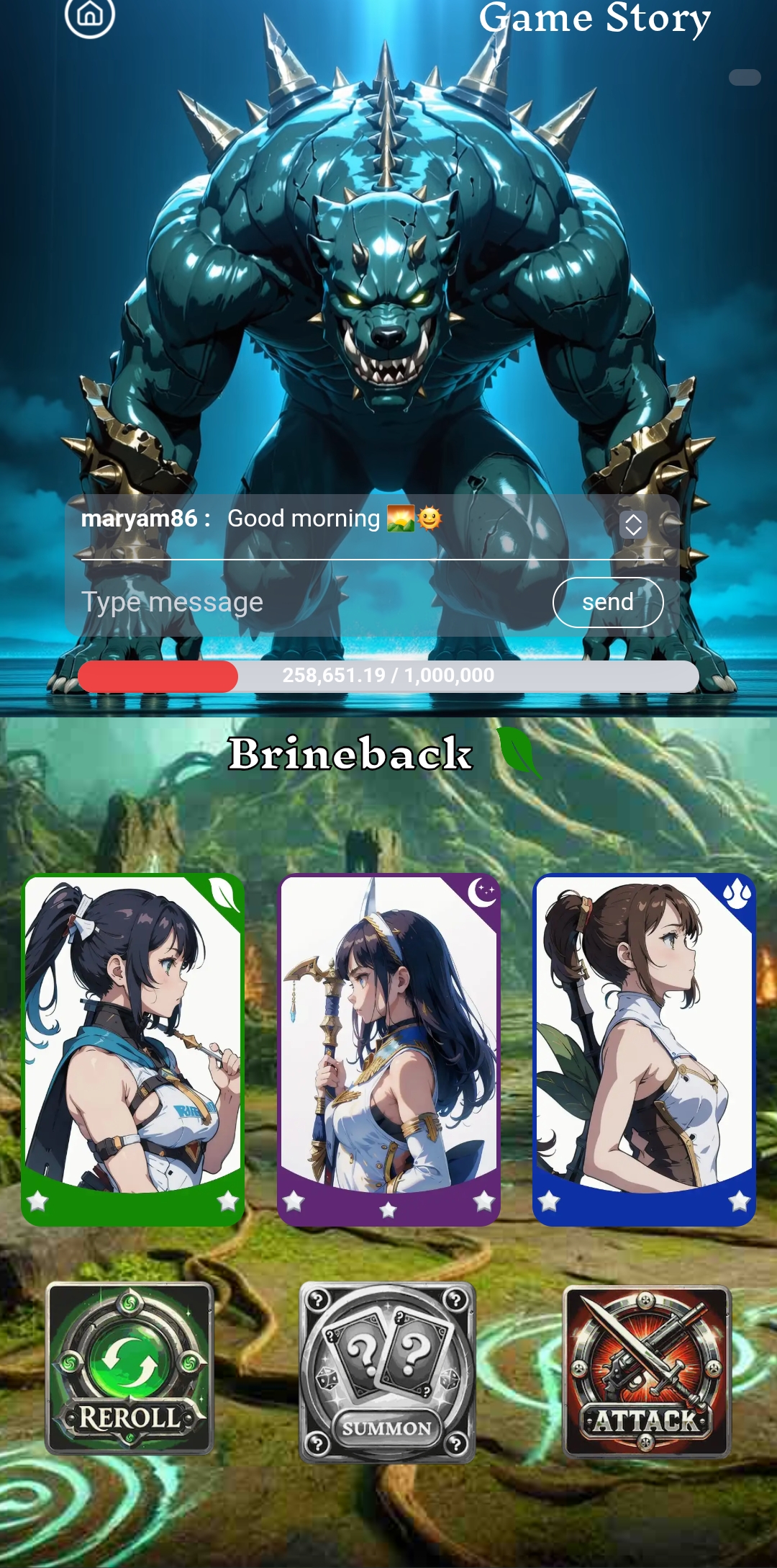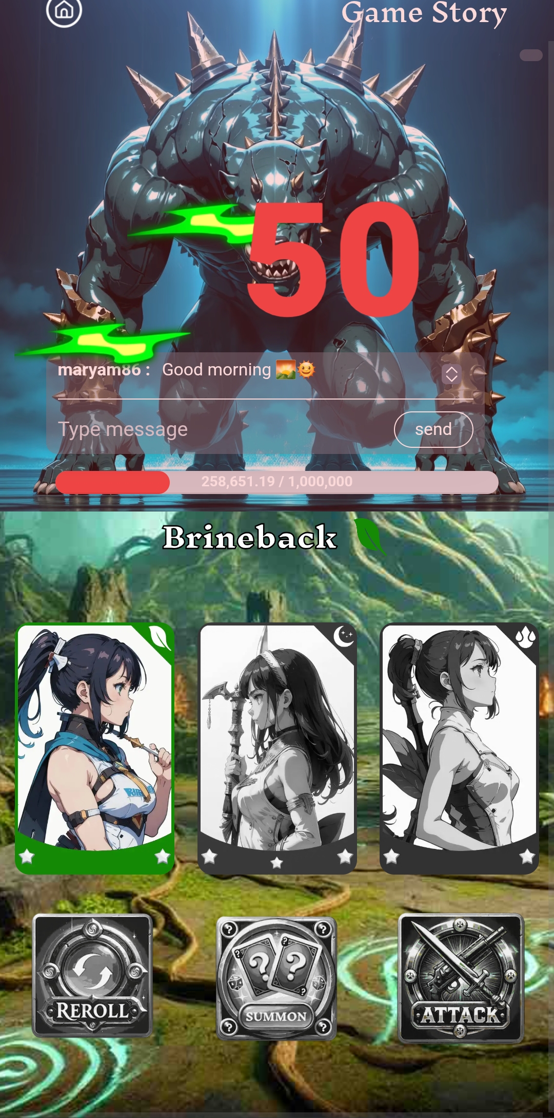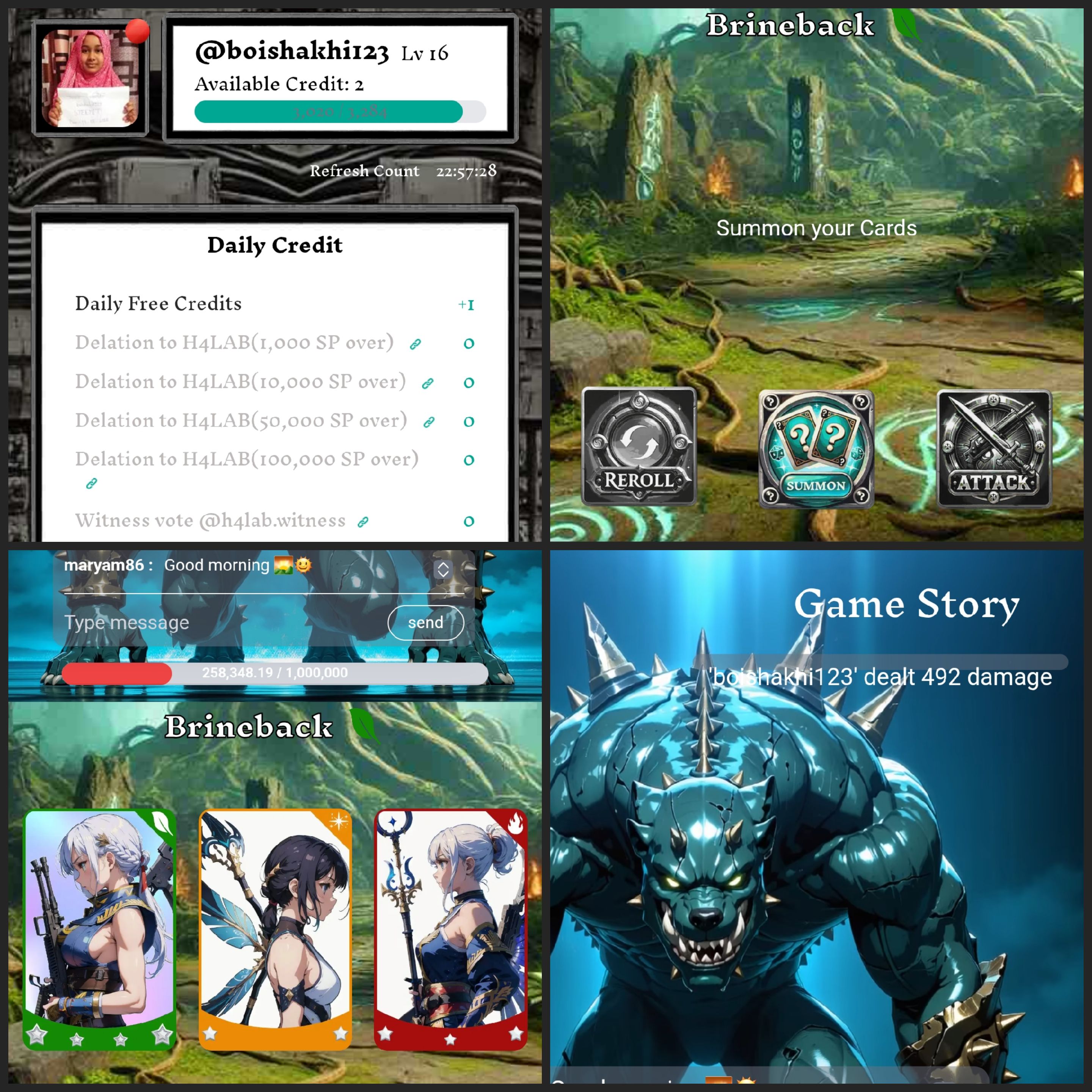 Since there was one more credit left. That's why I clicked on the summon option again. After clicking here, three more cards came. All of these cards had four stars, three stars each. That's why I clicked on the attack option. After clicking on it and fighting for a while, my damage points became 492.