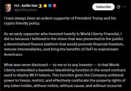 Does anyone know what this is all about? I don't get it... More importantly, does it signal any blowback coming towards Steem? Apparently, @justinsunsteemit is feuding with the Trump Family now? According to Grok's estimate, something like 18% of Sun's WLFI holdings were frozen in 2025 and remain frozen, now.
