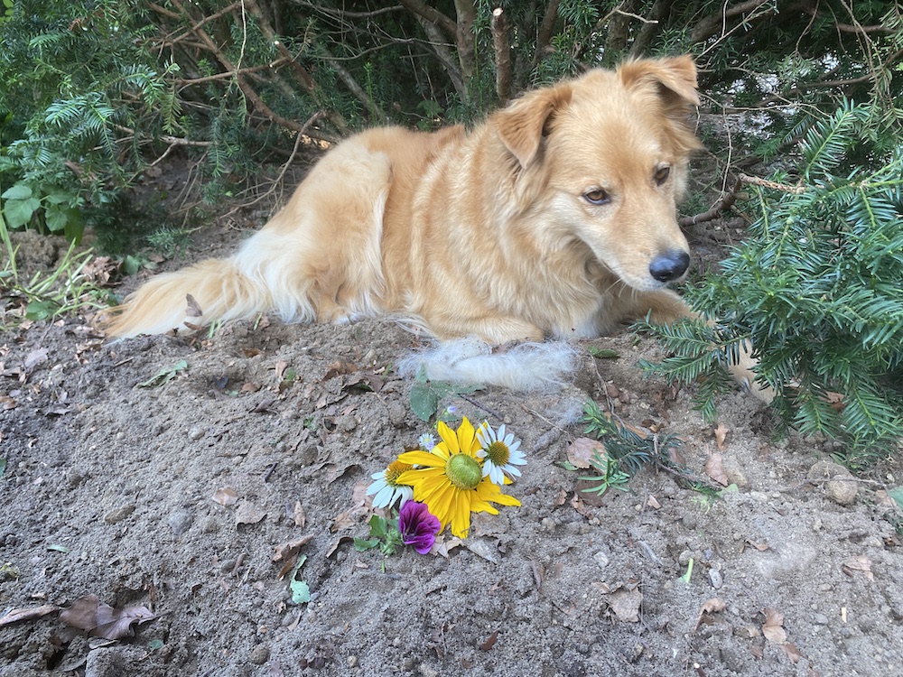 Nun passt er weiter auf sein Mädchen auf. Heute - am dritten Tag nach deinem Tod - legte Mäx sich erstmals nicht als erstes und lange auf dein Grab unter der Eibe.