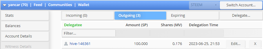 For delegate SP you can go to the "Delegation" section and select an account: @hive-146361 and delegate any amount, for every 1k SP you get 0.429 STEEM daily at 15:00, 0.0429 STEEM for every 100 SP.