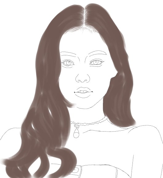 By using a dip pen or any hard brush of your choice, start tracing the outlines of the drawing. And in another layer, start drawing the hair. For me, I use fade pen brush for the hair as the base.