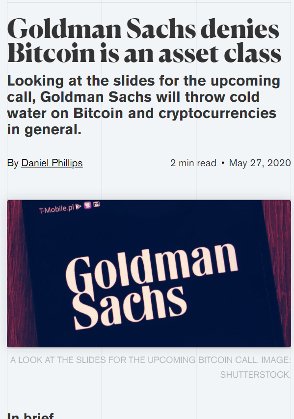 Last year in May, Goldman Sachs was pretty negative on bitcoin, saying things like this: