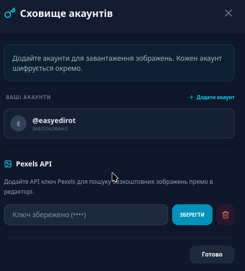 At this stage of development, it is categorically NOT recommended to enter your real Posting keys from your main accounts. The Pexels API is not as critical but is also encrypted.