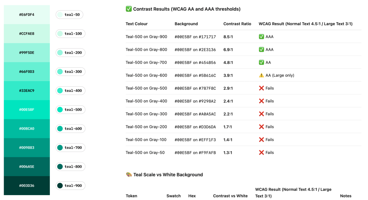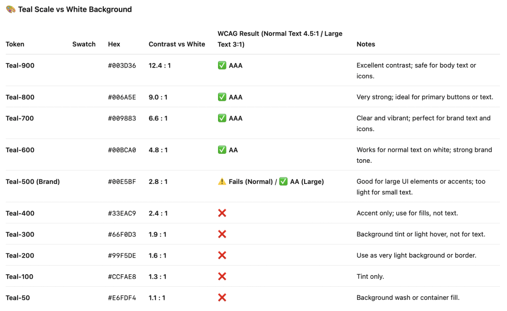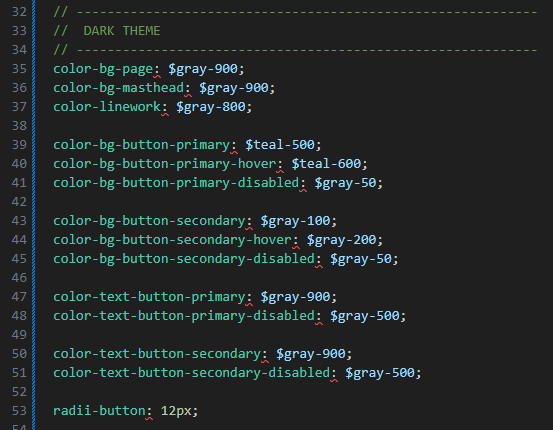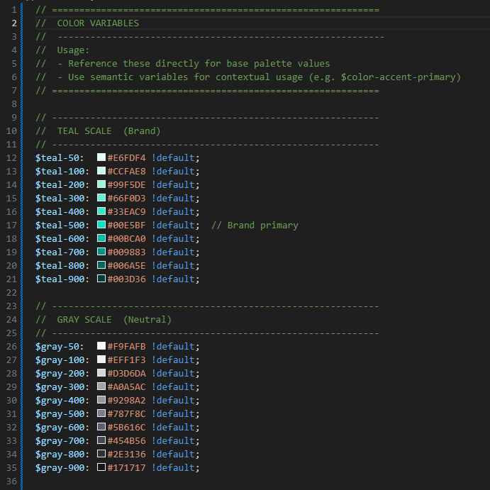 - Base tokens = literal values (e.g., specific teal/grey hex).