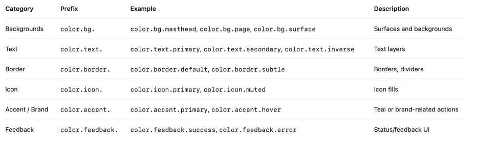 category.role.name.state.variant(omit segments that aren't needed) - Themeable: semantic tokens carry per-mode values (light, dark, optionally hc)