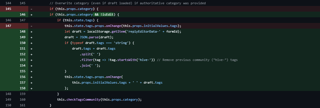 There is an additional condition to ensure that when editing a post, the tags aren't unnecessarily duplicated (line 146).
