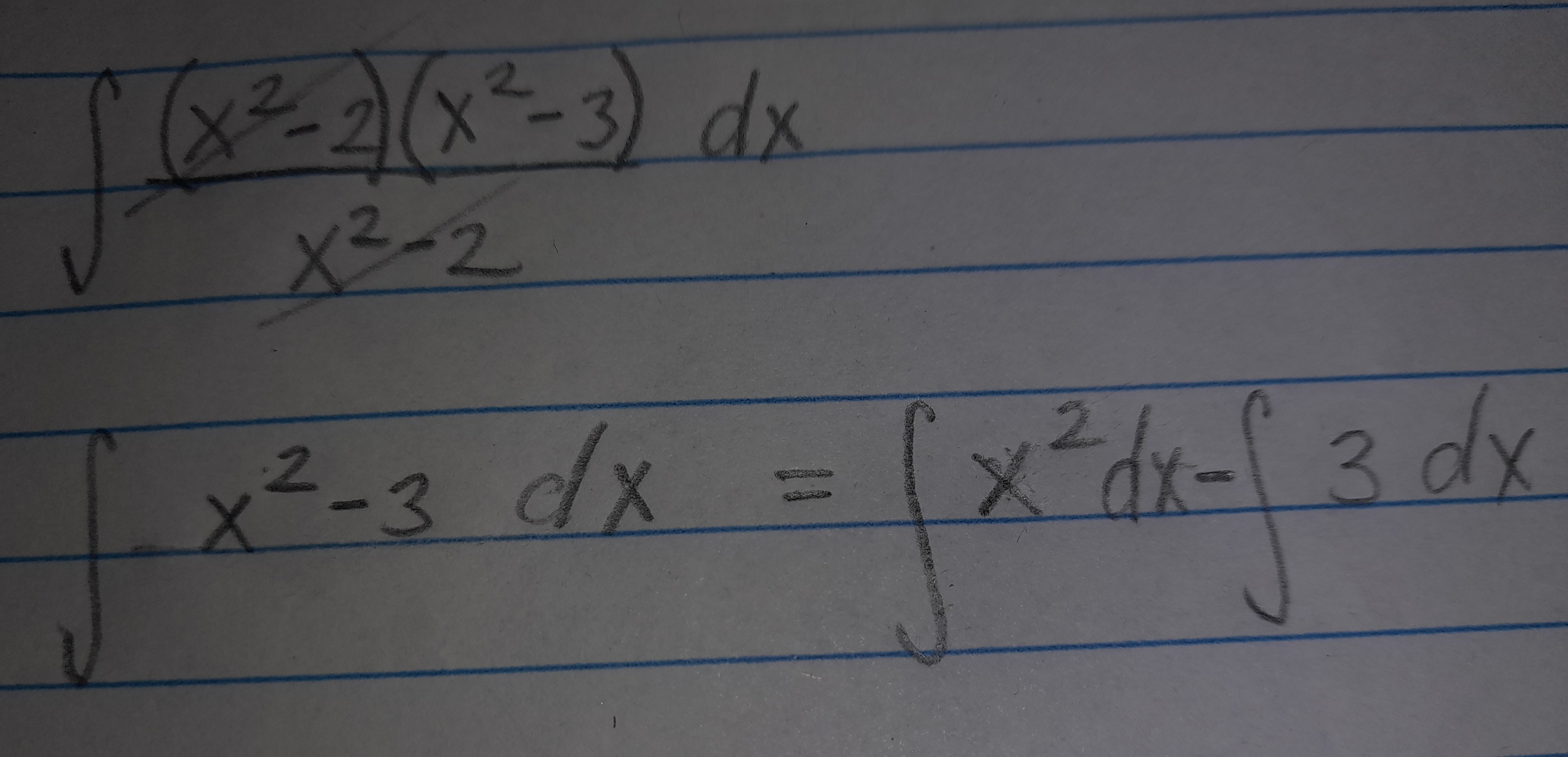 Como ya la hemos simplificado, podemos distribuir la integral y resolver cada uno por separado, para integrar "x^2" y "3" aplicamos las fórmulas de la tabla.