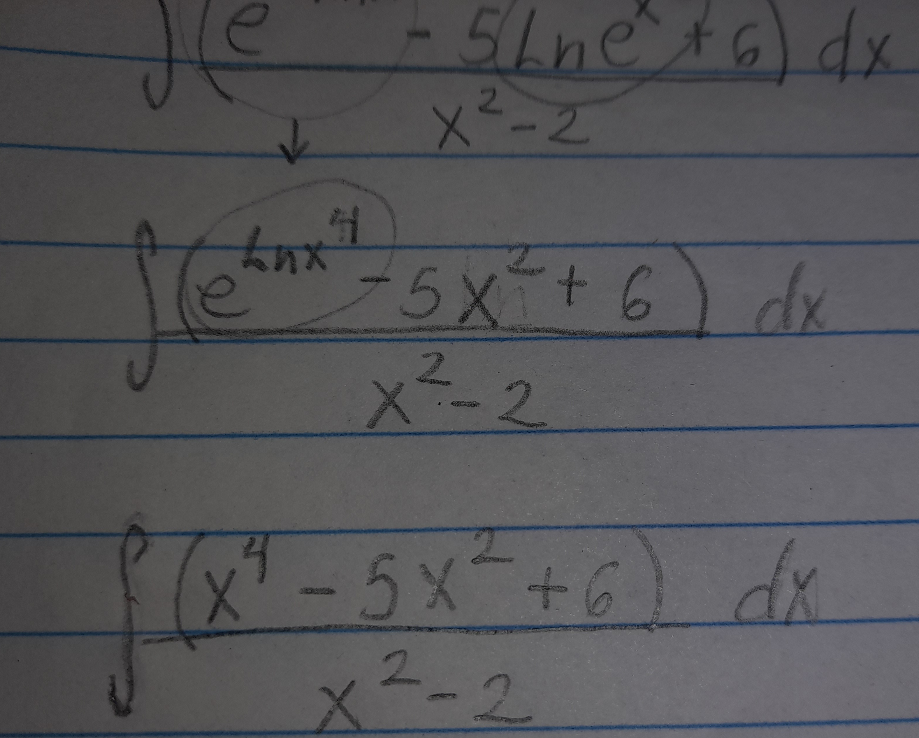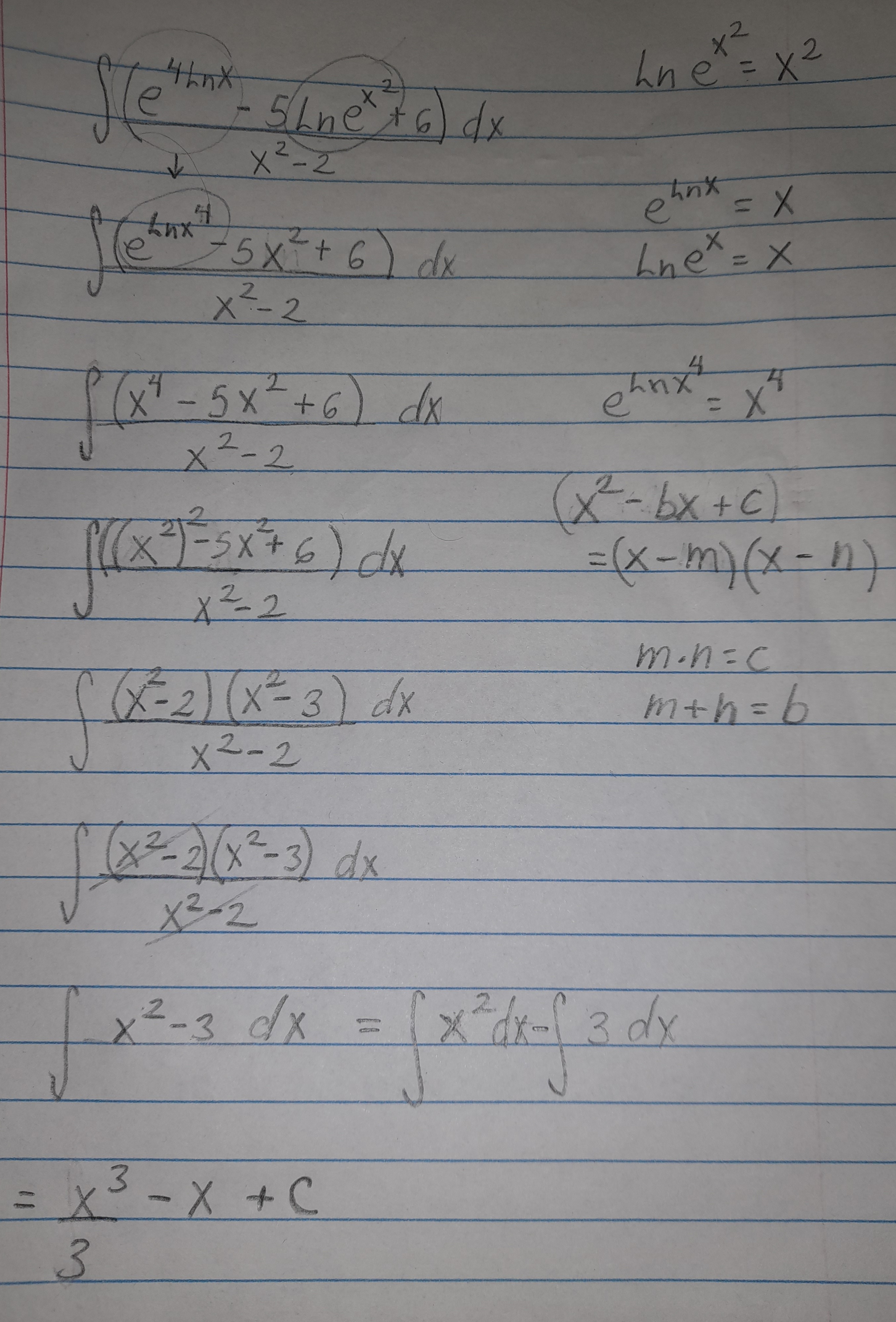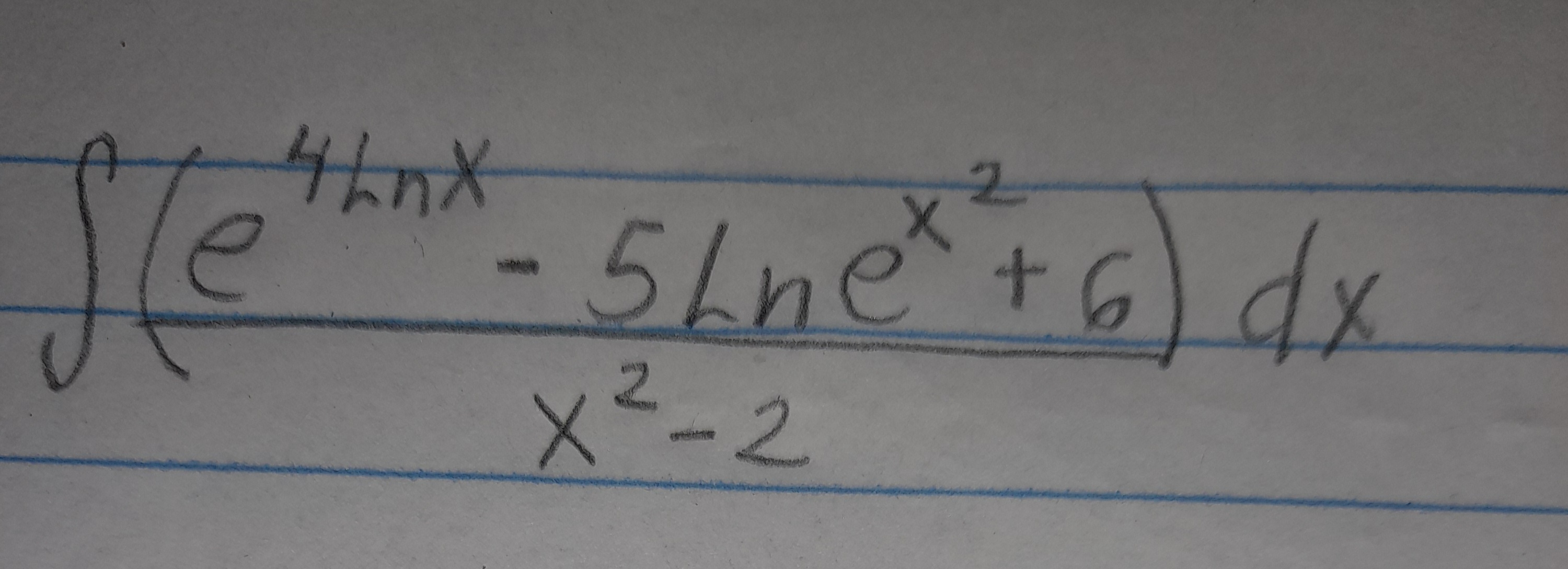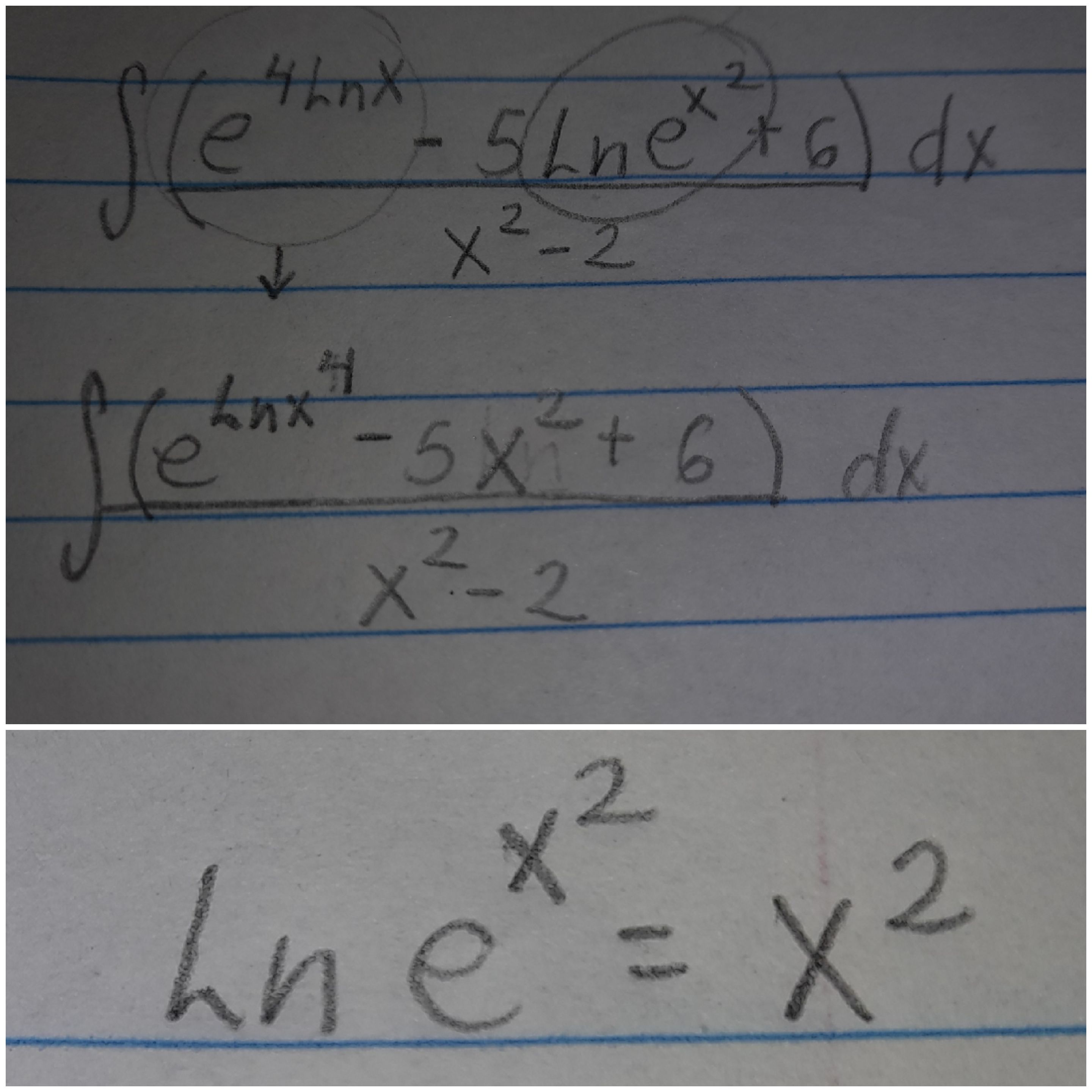 Primero, vamos a reescribir el "4lnx" como "lnx^4" y tendremos por propiedad de logaritmos y exponenciales que "ln(e^(x^2))" va a ser "x^2".