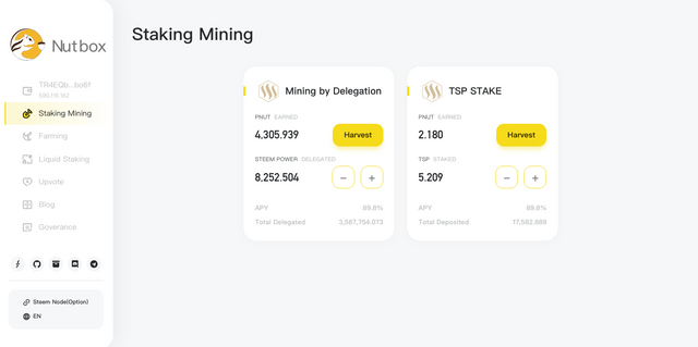 Nutbox utiliza el mecanismo de minería que a través del SP (Steem Power) con el cual puedes generar el token TRC20 PEANUT (conocido como PNUT) siguiendo un conjunto de reglas y condiciones, y distribuir estos token a los delegadores del SP. Hasta ahora la cuenta @nutbox.mine ya ha superado los 4.500.000 millones de Steem Power.