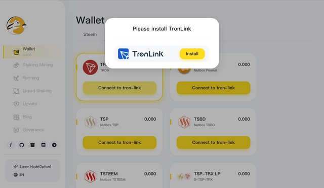 Tenga en cuenta que: Si no cuenta con la billetera TronLink, debe hacer clic en el botón "instalar" e instalar el complemento del navegador "TronLink".