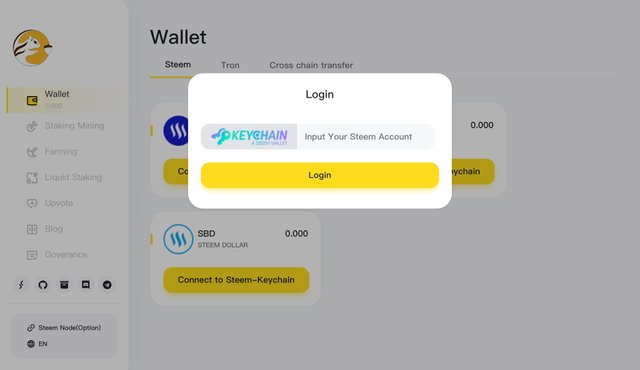 2 - En la etiqueta de la billetera, haga clic en "Conectar a Steem-Keychain", ingrese su ID en el cuadro emergente y haga clic en "Iniciar sesión".