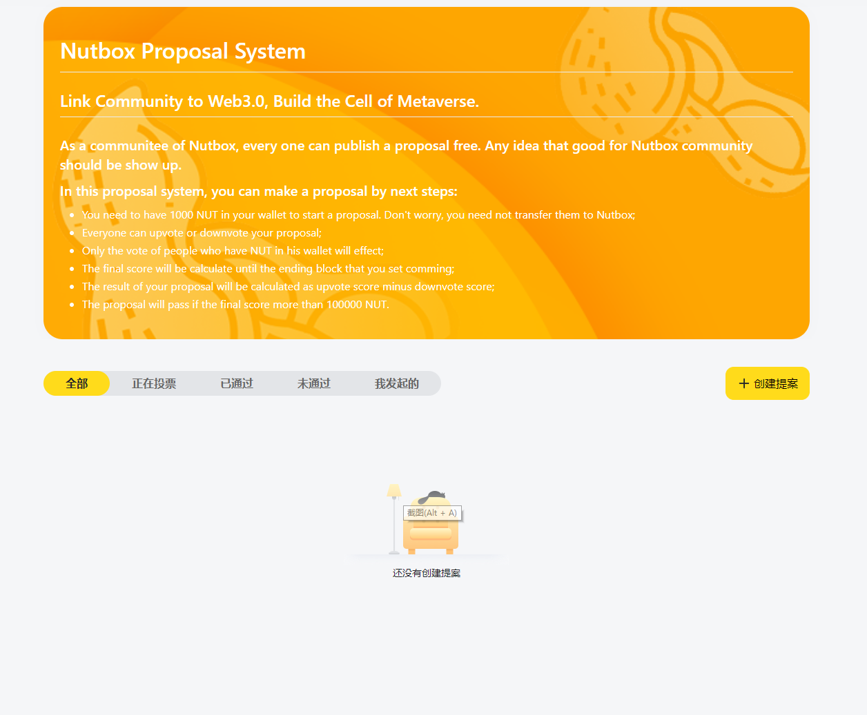 Nutbox has always been committed to the Dao concept. Community user driven development, so it is essential for its own proposal system and the communities created on nutbox to be able to create their own proposal system. Based on the above objectives, walnut's proposal system is developed.