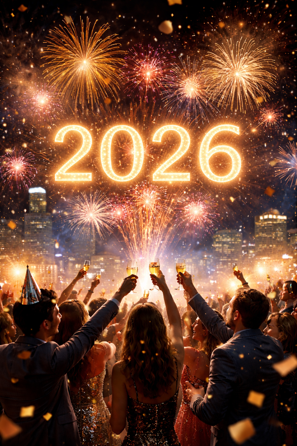 시계가 자정을 알리자, 2026년이 황금빛 불꽃과 약속처럼 얽힌 웃음소리 속에서 도시 위로 터져 올랐다.