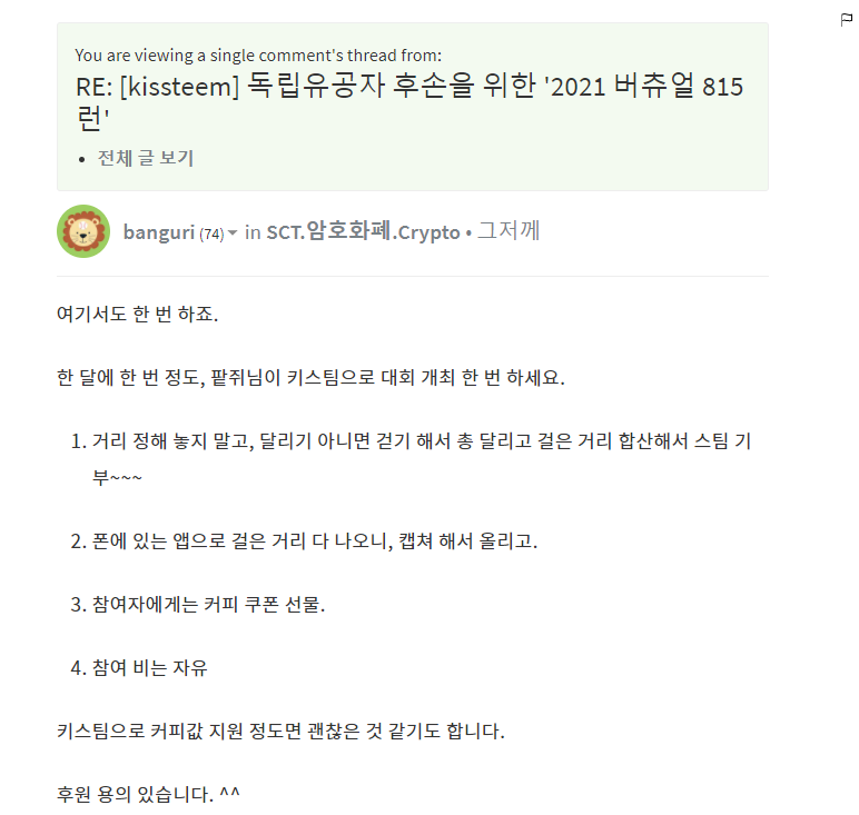 얼마 전 8.15 마라톤에 참여했습니다. 참여금과 후원금은 독립유공자 가족분들이 지내실 곳을 수리하는데 사용하는 아주 의미있는 행사였습니다. 많은 분들께서 관심을 가지고 참여 의사를 내비치는 가운데 사과님(@banguri)께서 좋은 아이디어를 주셨어요!!!