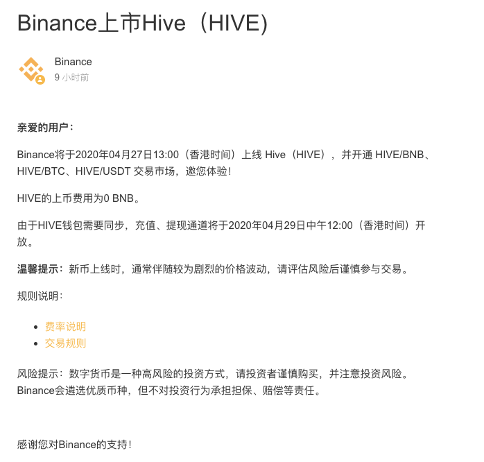 你敢相信币安的安全吗?HIVE挂牌的交易通告,是在交易前的2小时发出的!!!!!