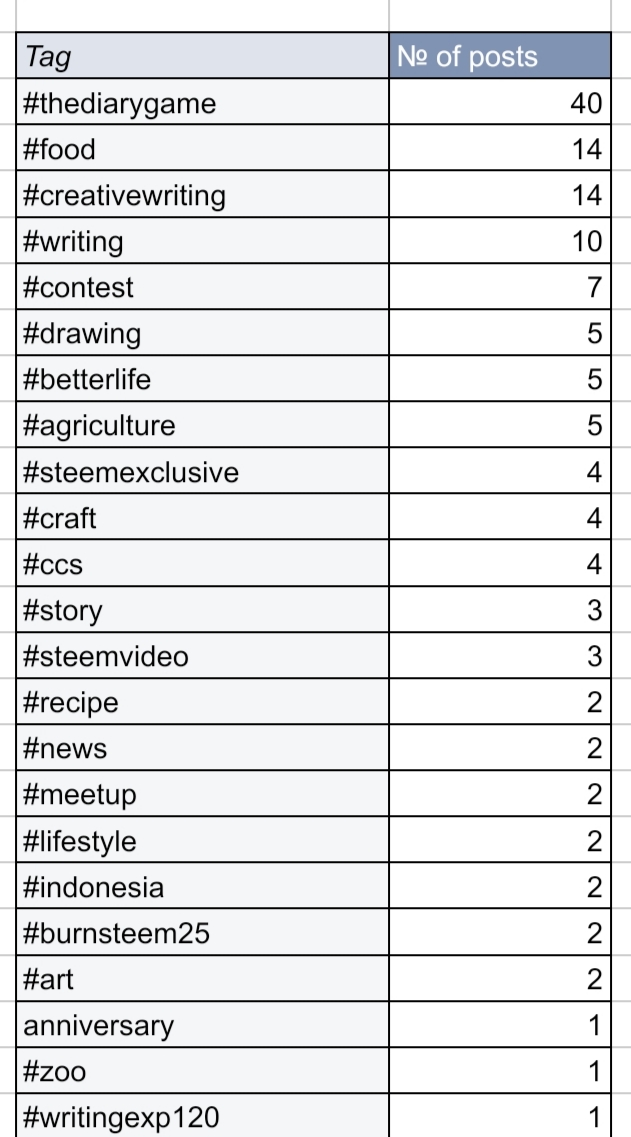 We are not limited to specific tags, we try to cover different tags to reach more authors by following the content created by different authors and the following graph represents the statistics of the different tags headed by the tags #thediarygame, #food and #creativewriting.