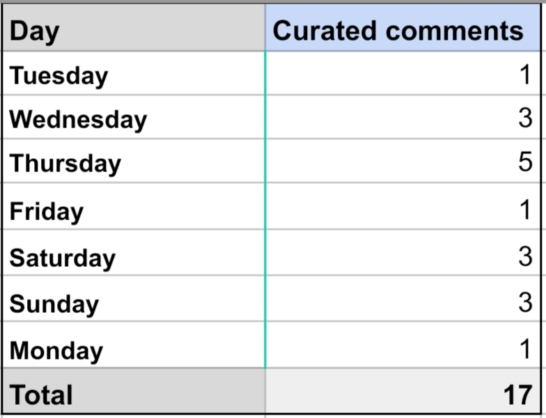 For this week, each curator was assigned a specific day to help authors meet the standards. Each curator was required to curate at least 20 quality posts.