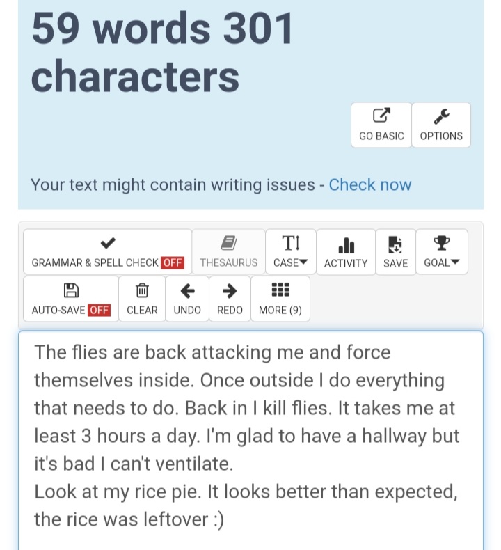 The flies are back attacking me and force themselves inside. Once outside I do everything that needs to do. Back in I kill flies. It takes me at least 3 hours a day. I'm glad to have a hallway but it's bad I can't ventilate.