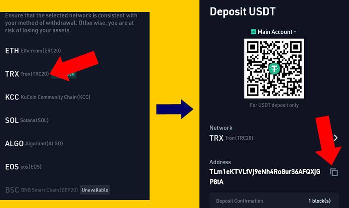 Step 4: Next, you need to select the network that you will use for receiving the coin. We are going to use TRC-20 for this deposit. So I will select TRX(TRC-20) from the options. After that, I will then copy the address by clicking the copy symbol just beside the address and send to the person that will deposit the USDT into my address. Check the image below: