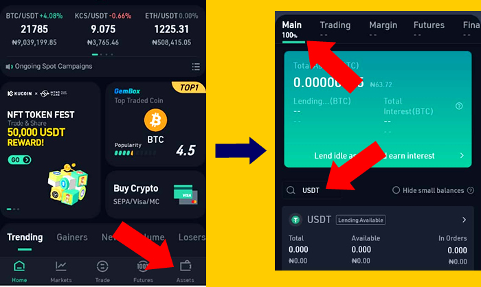 Step 1: Open the Kucoin mobile app. It will take you to the home page. On the bottom right hand corner of the screen, click on Assets.