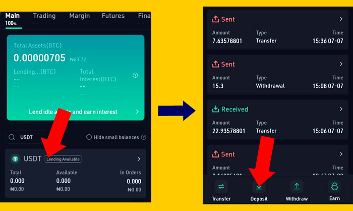 Step 2: Click on Main. Then, search for the name of the coin you wish to deposit. In this case, I searched USDT. Check Image below.