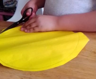 Next, we cut the circle out with the scissors. Practice safety when handling the sharp scissors and make sure an adult is there to guide the use of the sharp objects!
