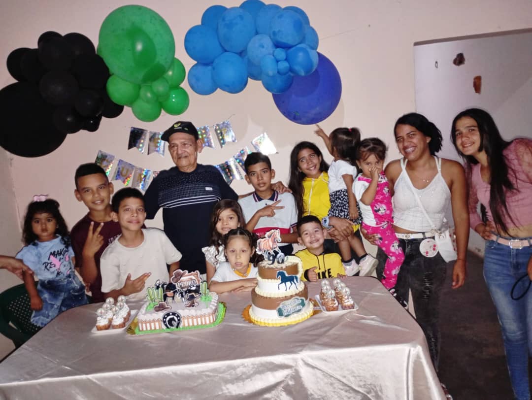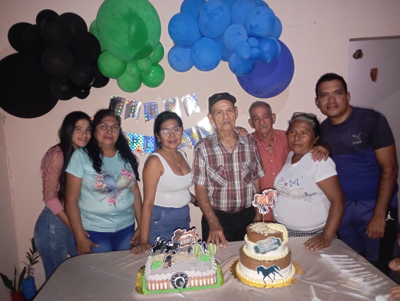 Y así transcurrido el día al caer la noche llegó el momento de la torta el como en todo el día muy contento de compartir con hijos nietos y bisnietos dónde expreso su agradecimiento y pidió a Dios le concediera 150 años