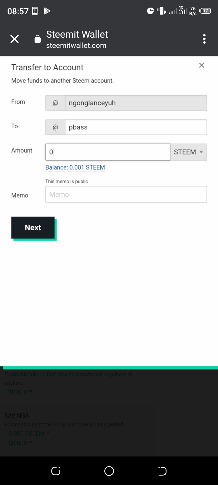 so i clicked on it and selected the transfer. Another box appeared and I enter the account name, the amount to be transferred, and the public memo I want to send the tokens to. I use my active key to confirm the transaction.