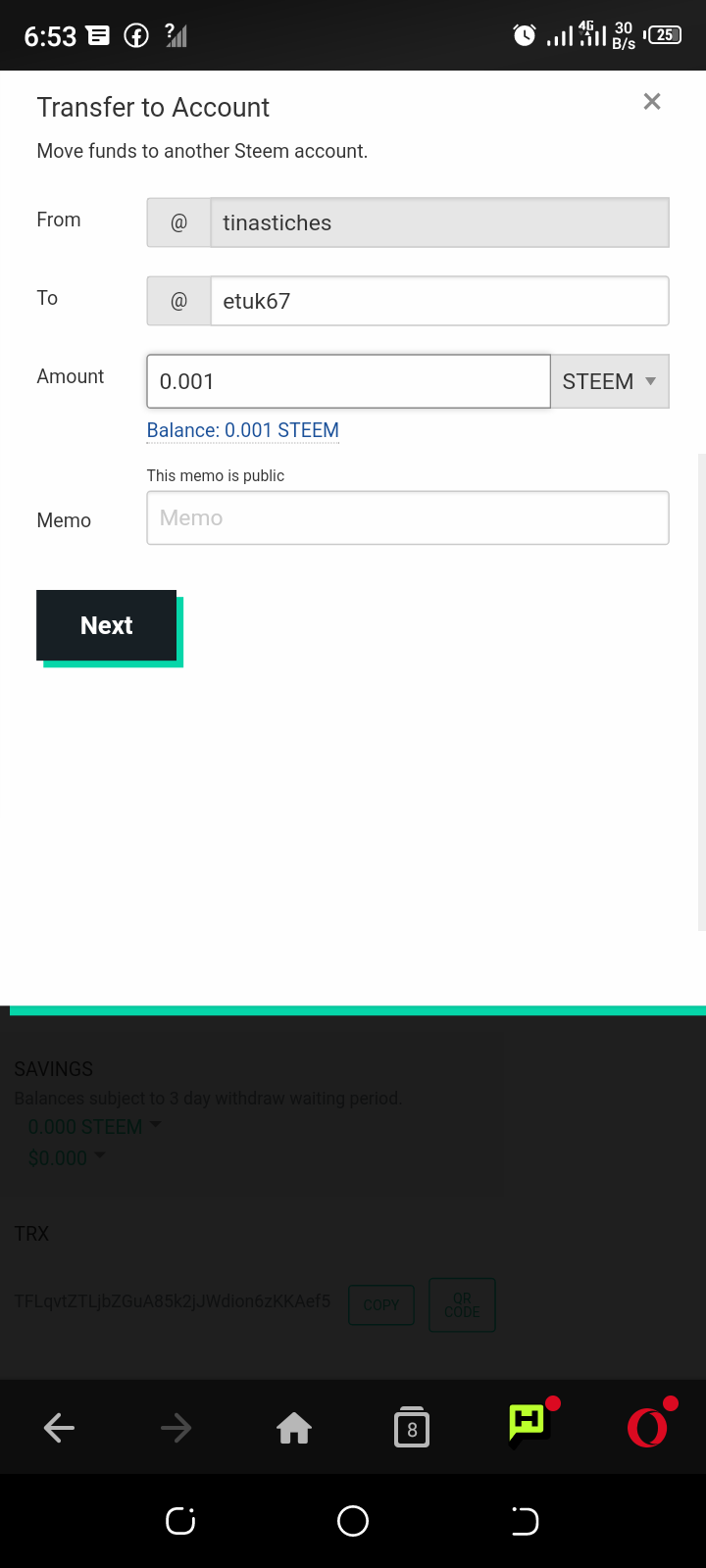 Finally, I type in the steem username I want to transfer the steem to and the amount i wish to transfer and the click next.