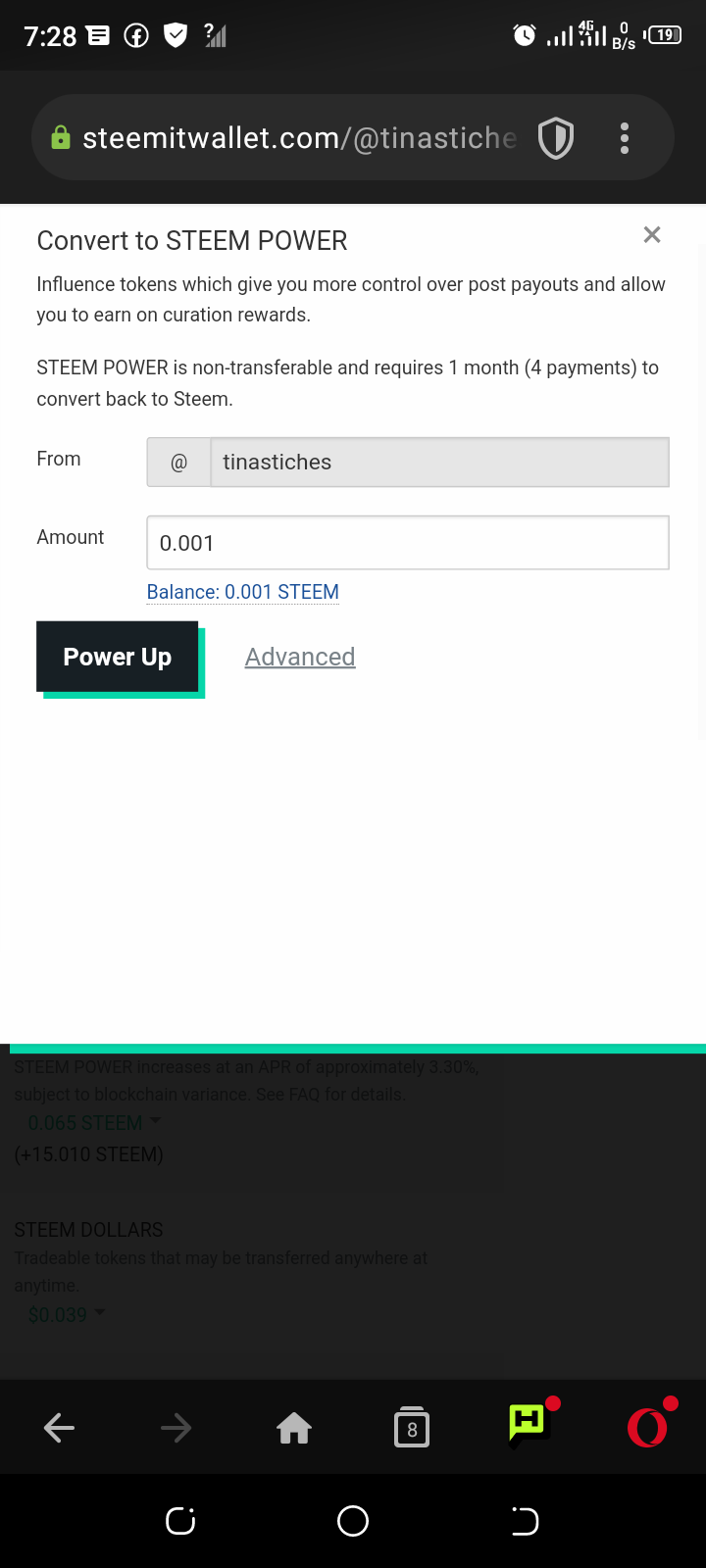 Click on the arrow beside steem and select power up, then type in the amount to power up and then click on the power up and my account will be powered up successfully.