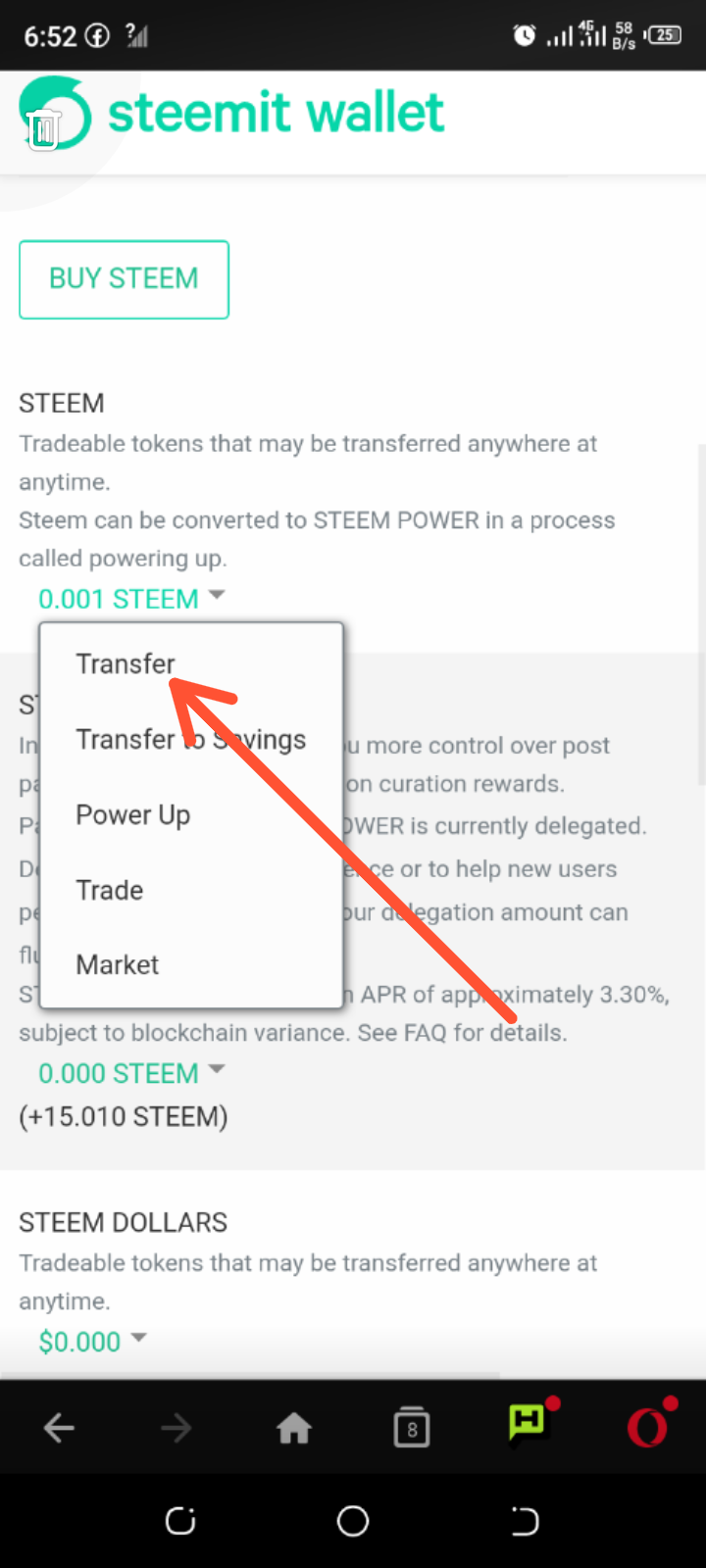 After that i click on the arrow beside steem and choose transfer