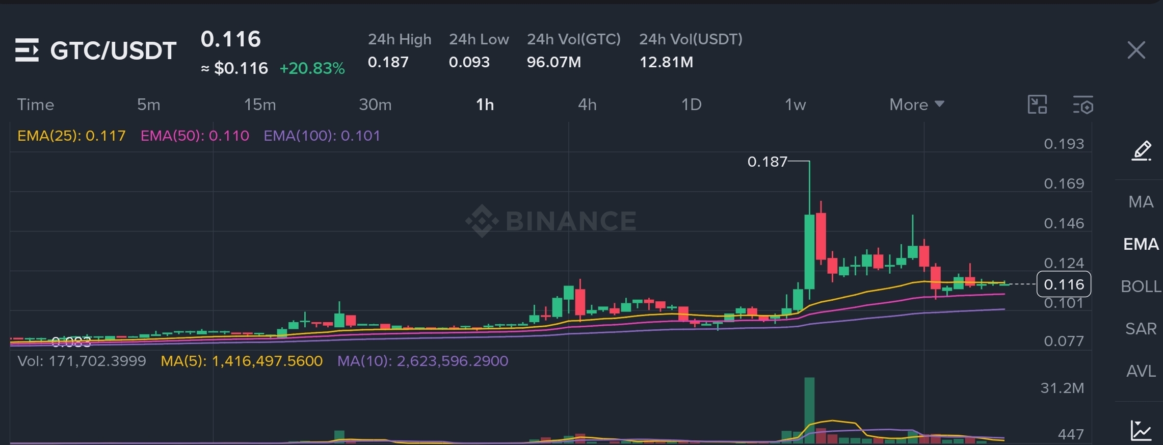 GTC/USDT on Binance just surged +20.83% in 24 hours to $0.116, hitting a high of $0.187 with strong volume 96.07M GTC traded + $12.81M USDT!