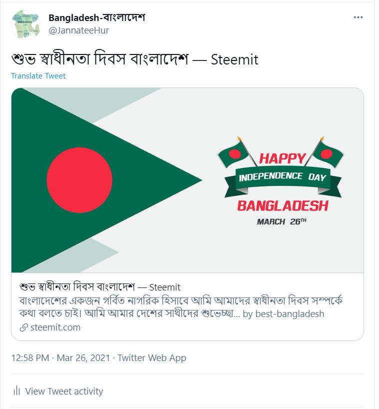 You are viewing a single comment's thread from:RE: শুভ স্বাধীনতা দিবস বাংলাদেশView the full contextbest-bangladesh (51)memberin Writing & Reviews • 5 years ago https://twitter.com/JannateeHur/status/1375341297523826691