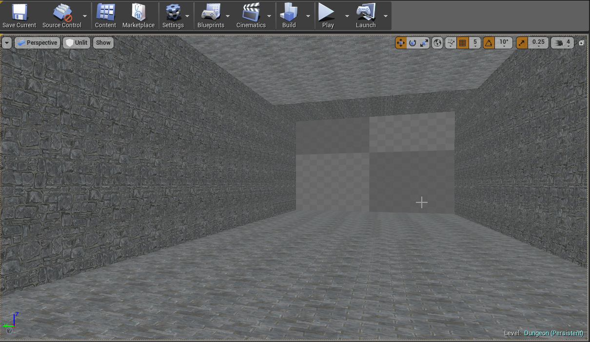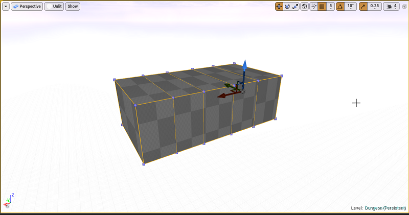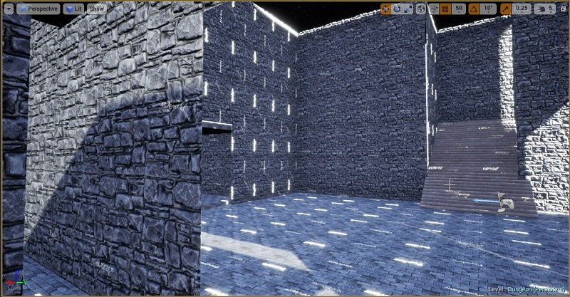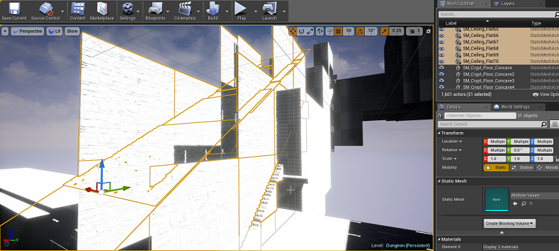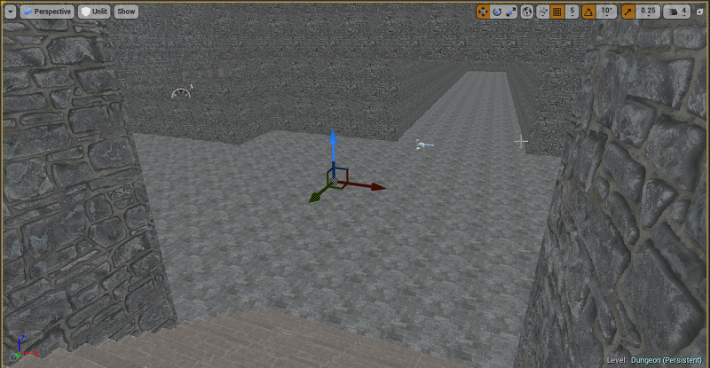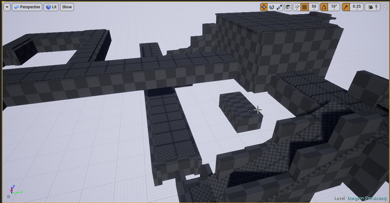 I can just use static meshes and make rooms out of them that I copy and paste. This is in part what I did in my first zone. I, however, wanted a more elegant and sure-fire way of not having mistakes crop up over time if a section was missed or something somehow separated. For now, I need to put more time into this and so I went on to another way of using BSP brushes.