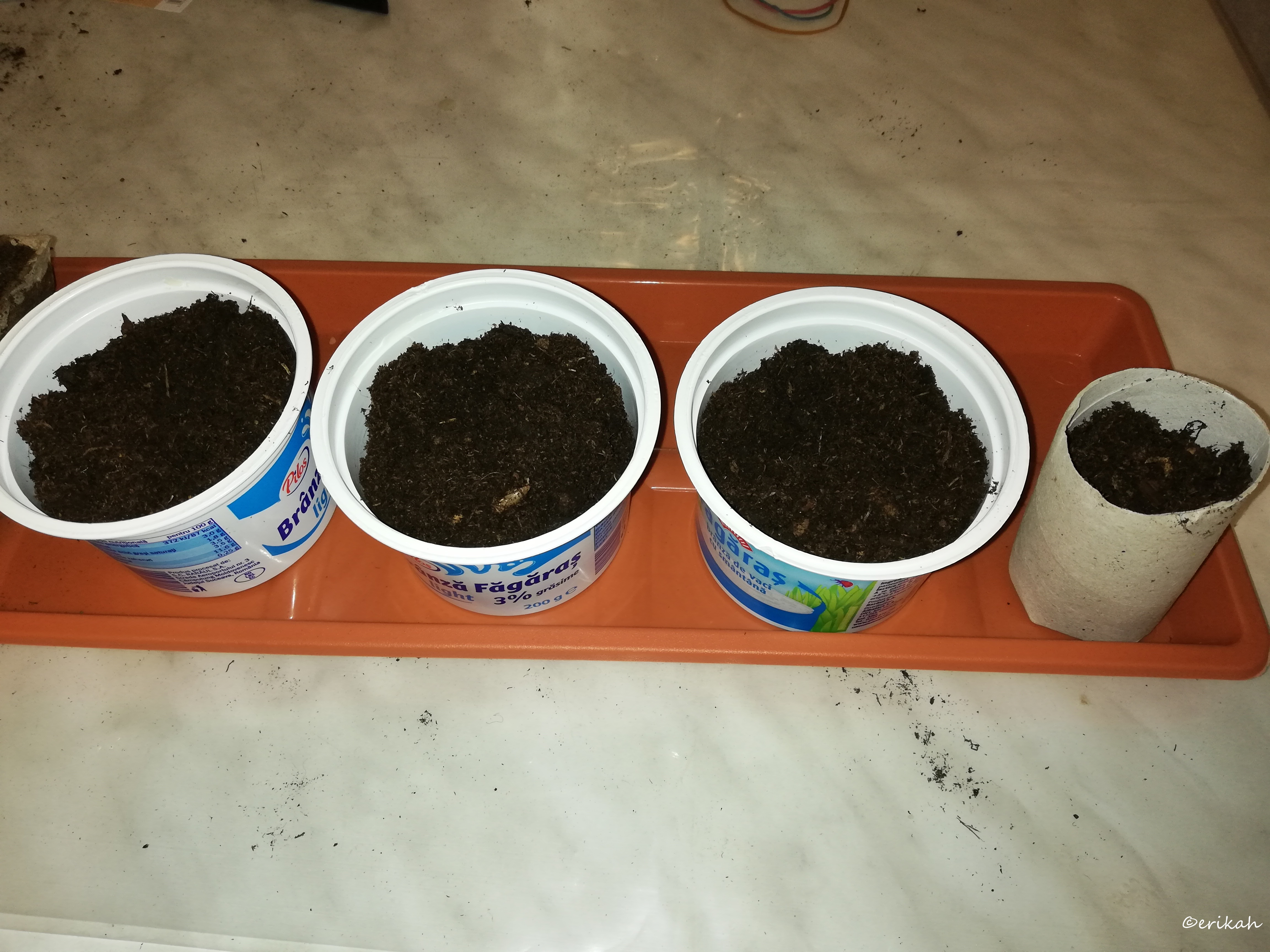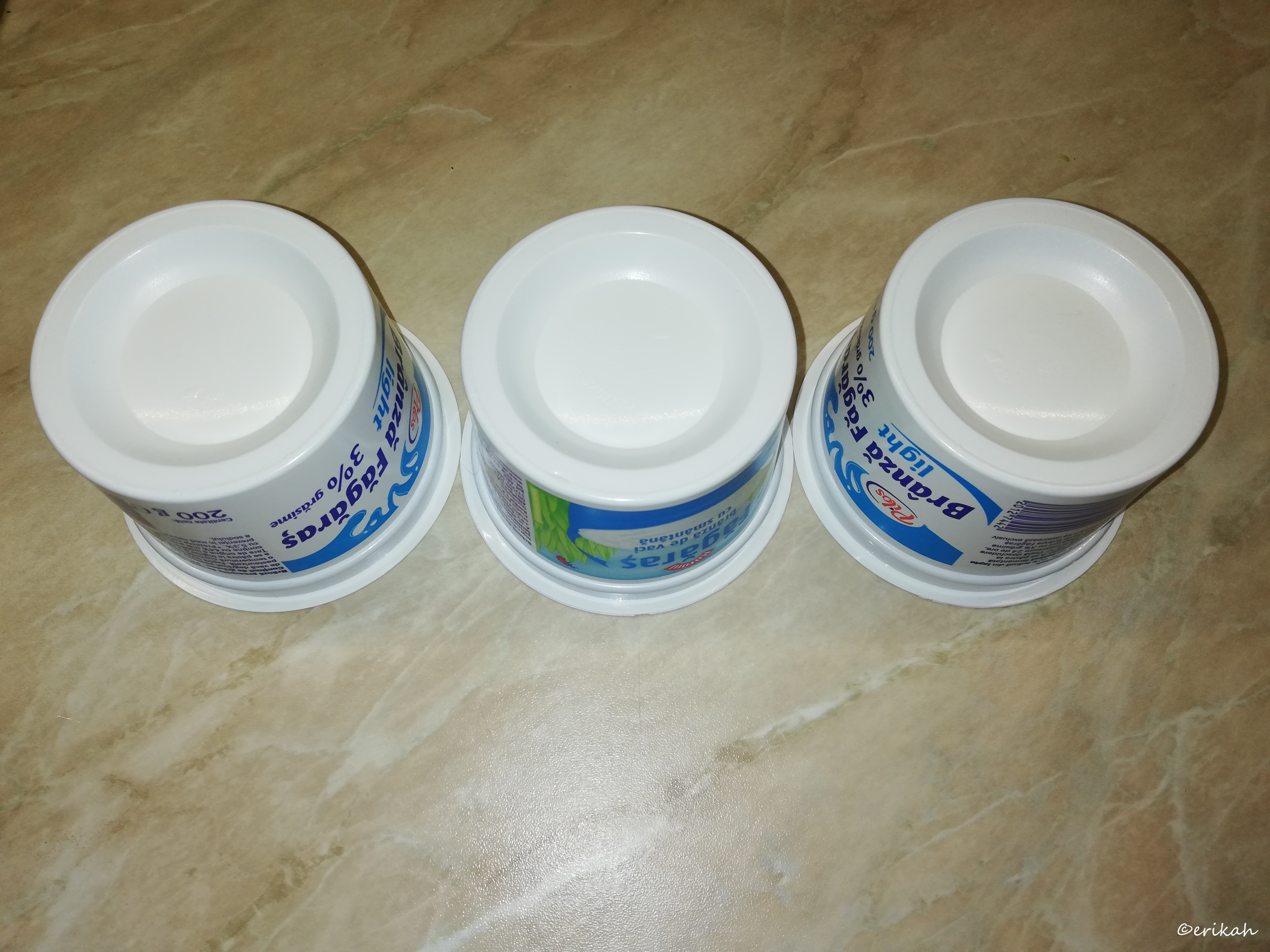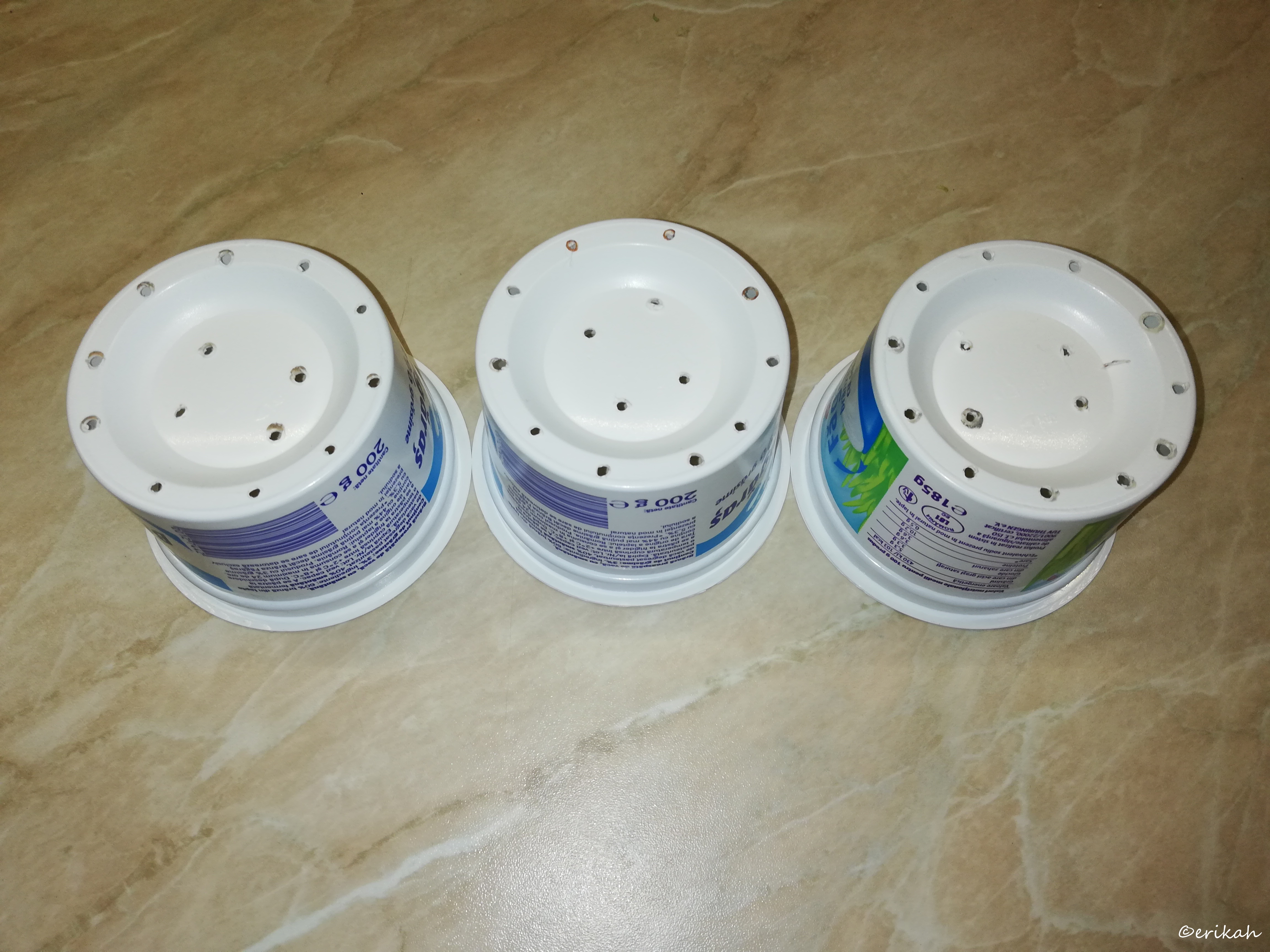 Another way is to recycle some plastic cups that are not needed anymore. As there's not much recycling going on in my city, I'm repurposing what I can. These are plastic cups of dairy products. It's hard plastic, you can't just make a hole with a needle or a nail as they broke. I had to heat a nail and make holes. Befor eyou start telling me it's not safe as burning plastic is toxic, there were just three.