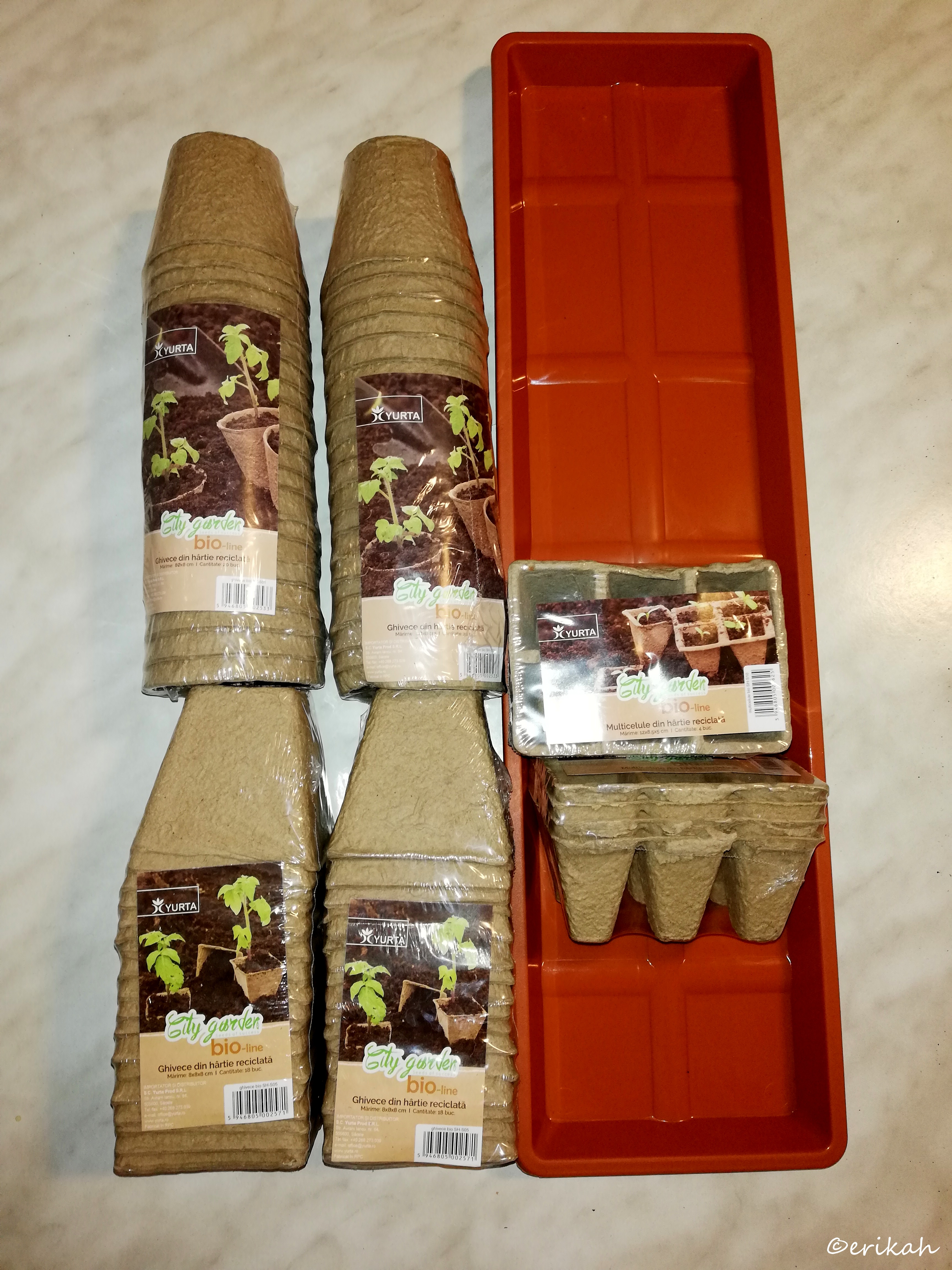 Seed pots of different shapes, made of recycled paper and a tray to place the pots on. I'm really proud of my dad for making this amazing choice. He has plastic trays at home but today he chose to buy paper without me telling him anything. Good choice!