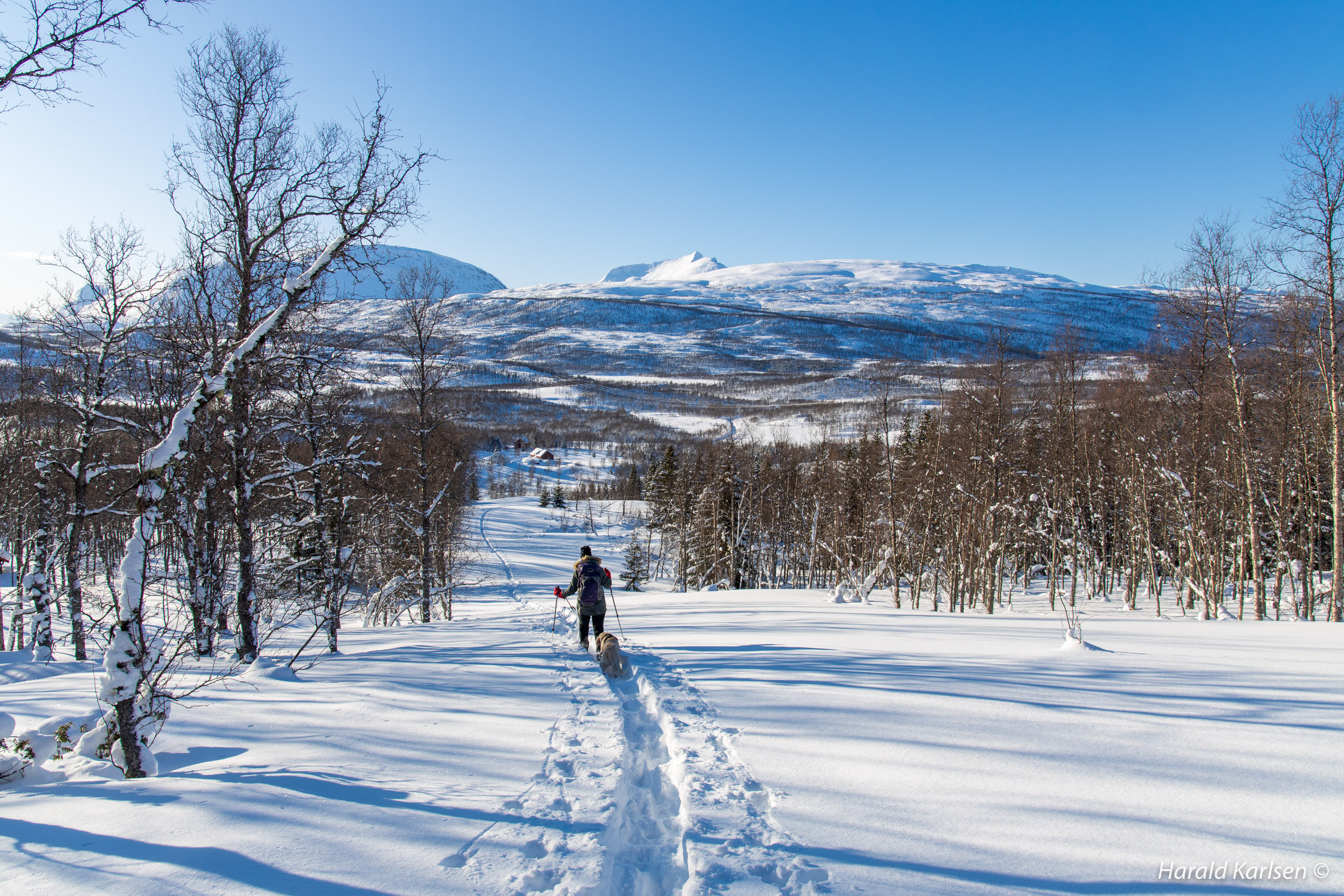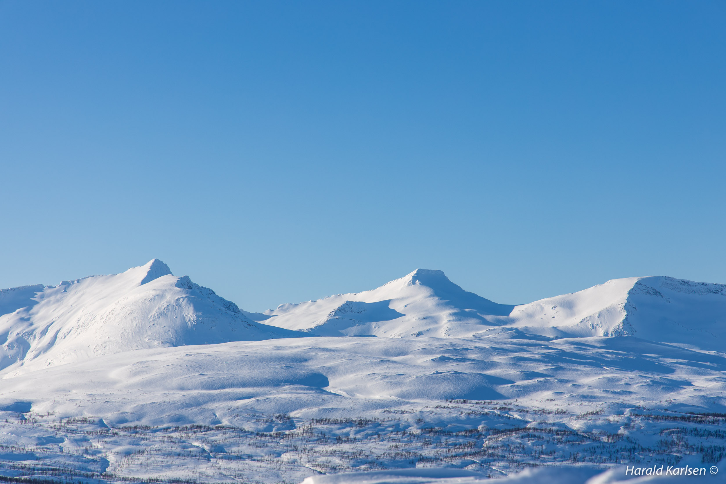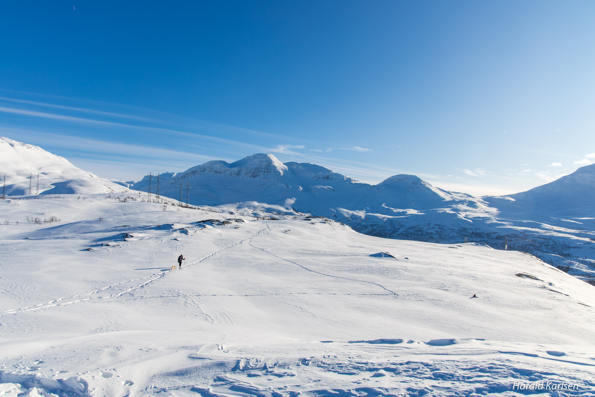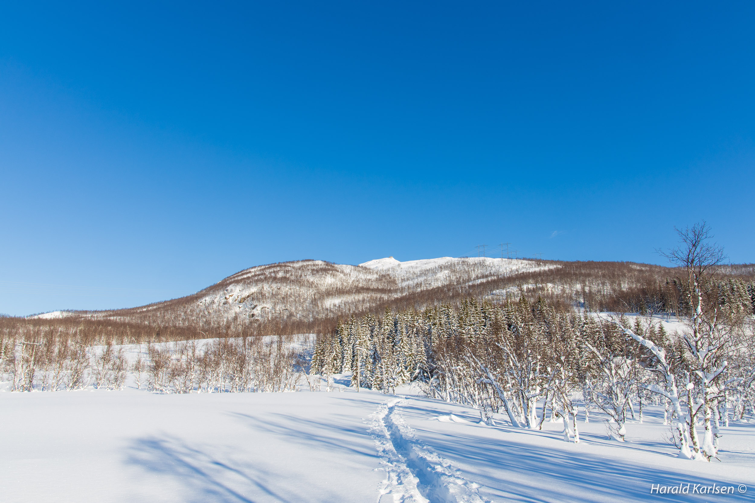 Unfortunately the weather then was very unstable with few days of cold and clear weather. Some clouds is ok though to break up the sky and add life and contrast. Today we had waited long enough, the weather was great, blue sky and minus 14 degrees celsius. So around 9 o'clock we was on our way for todays adventure. We started by the house to the left in the picture. We met one of the persons who had built the cabin and got tips for the best route up the hills.