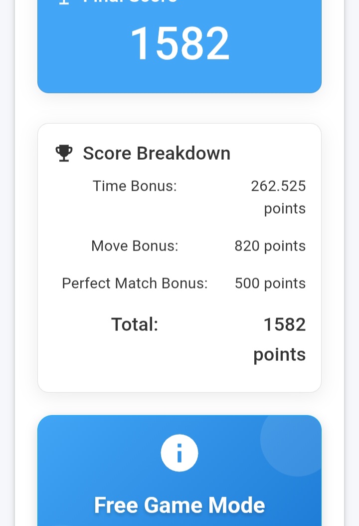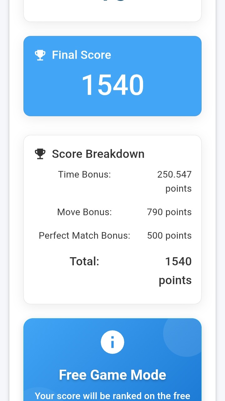 In my second game, I performed much better. I used only 20 moves and finished the game in just 48 seconds. This time my score was 1551, which was my 2nd best score today. I felt really happy with this result.