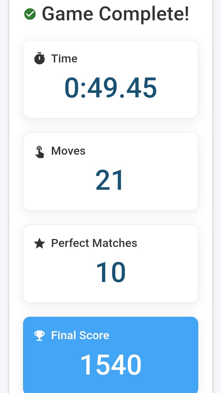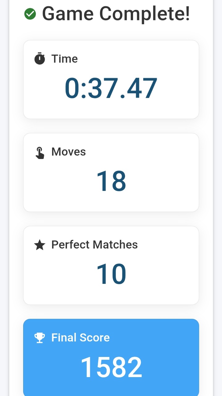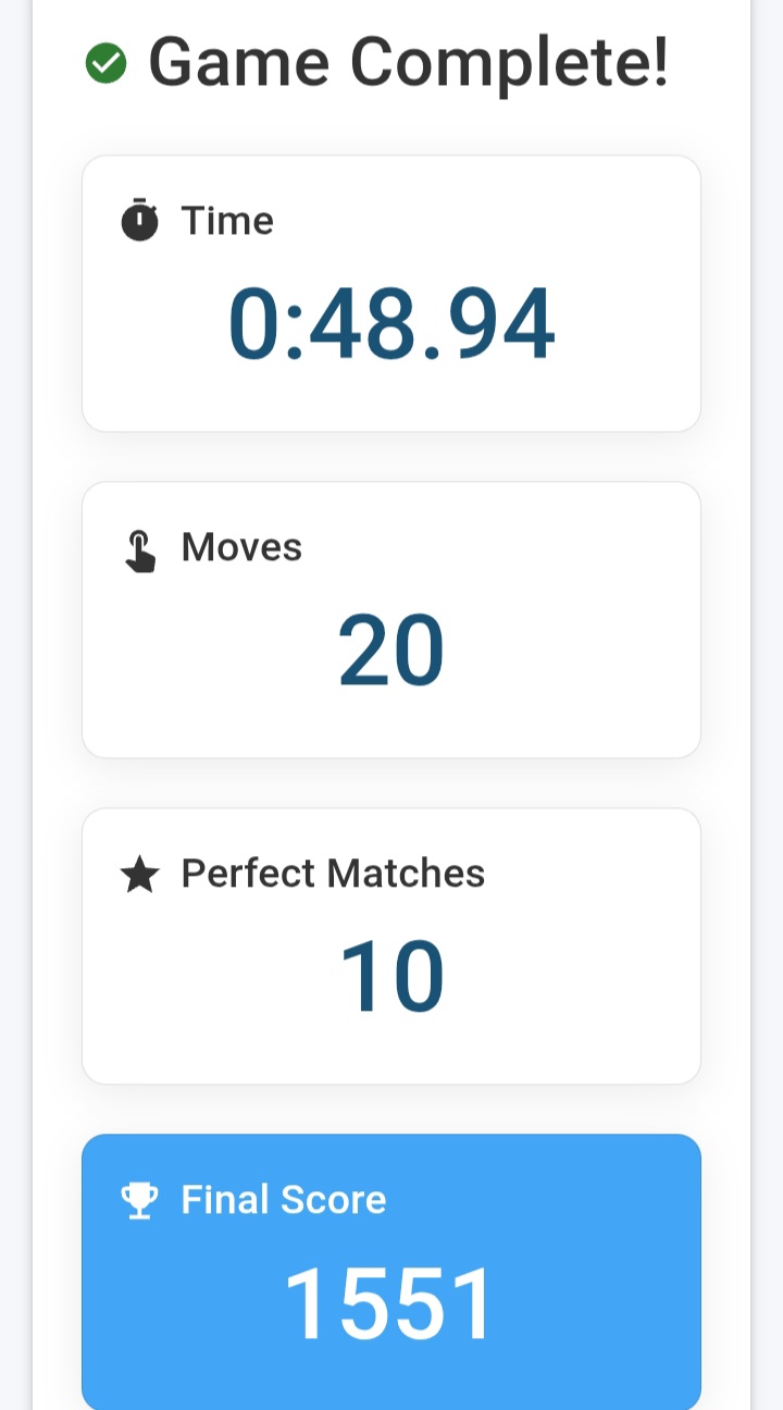 When the game started, I felt a little confused in the beginning. It was not easy to remember the position of all the cards. But after matching a few pairs, it became easier and I started to understand the pattern.